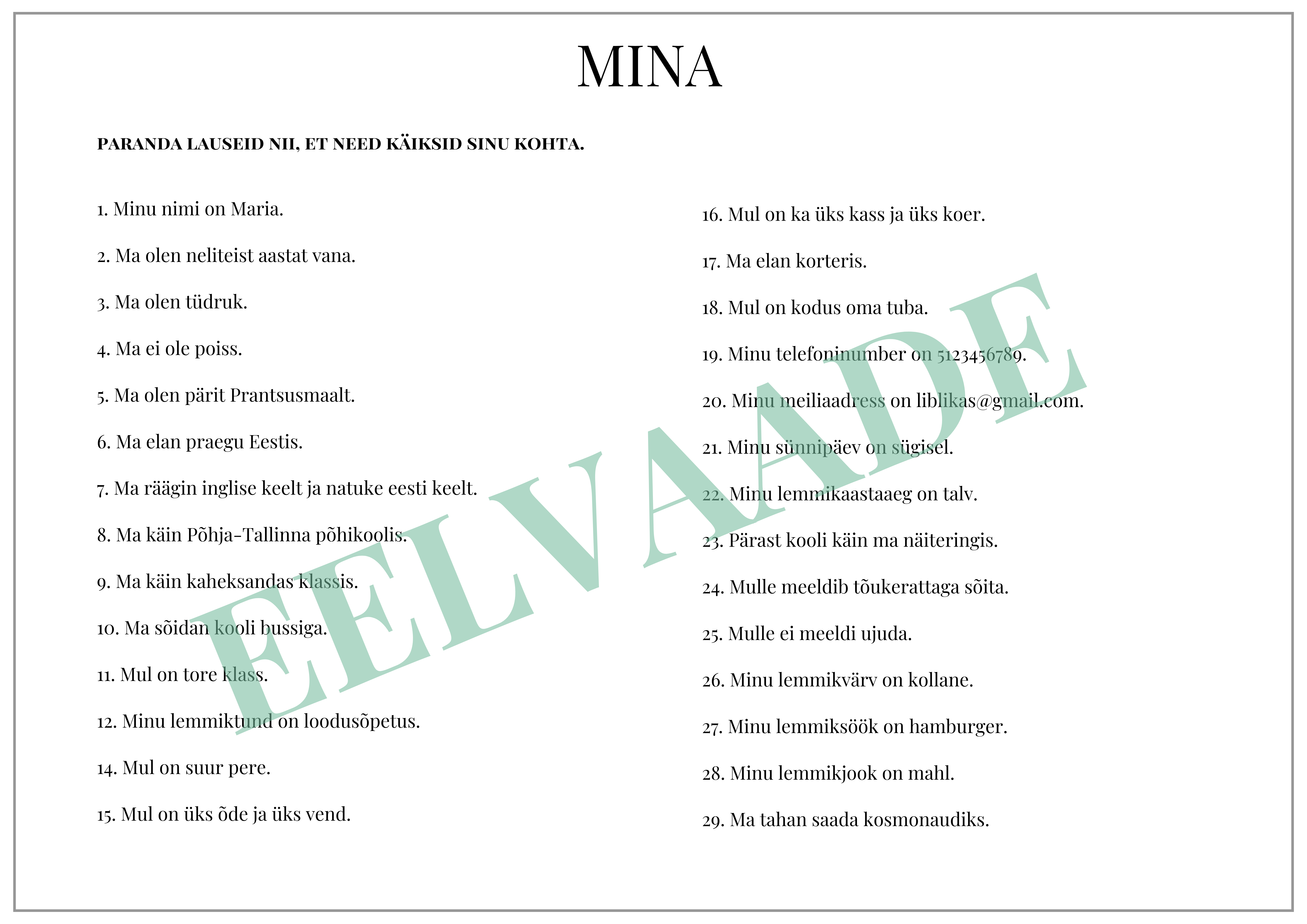 Õpilane parandab töölehel lauseid nii, et need käiksid tema kohta.
