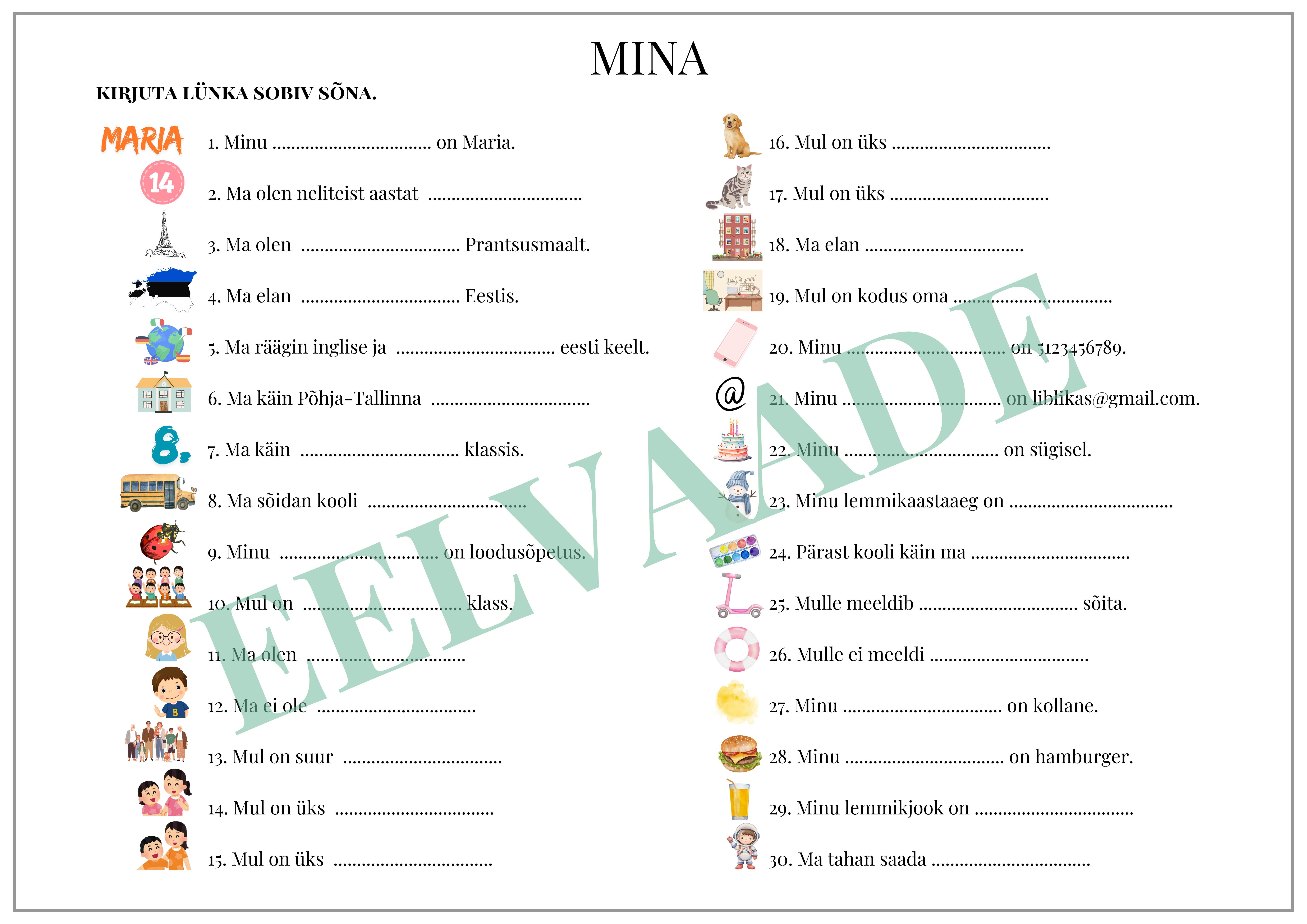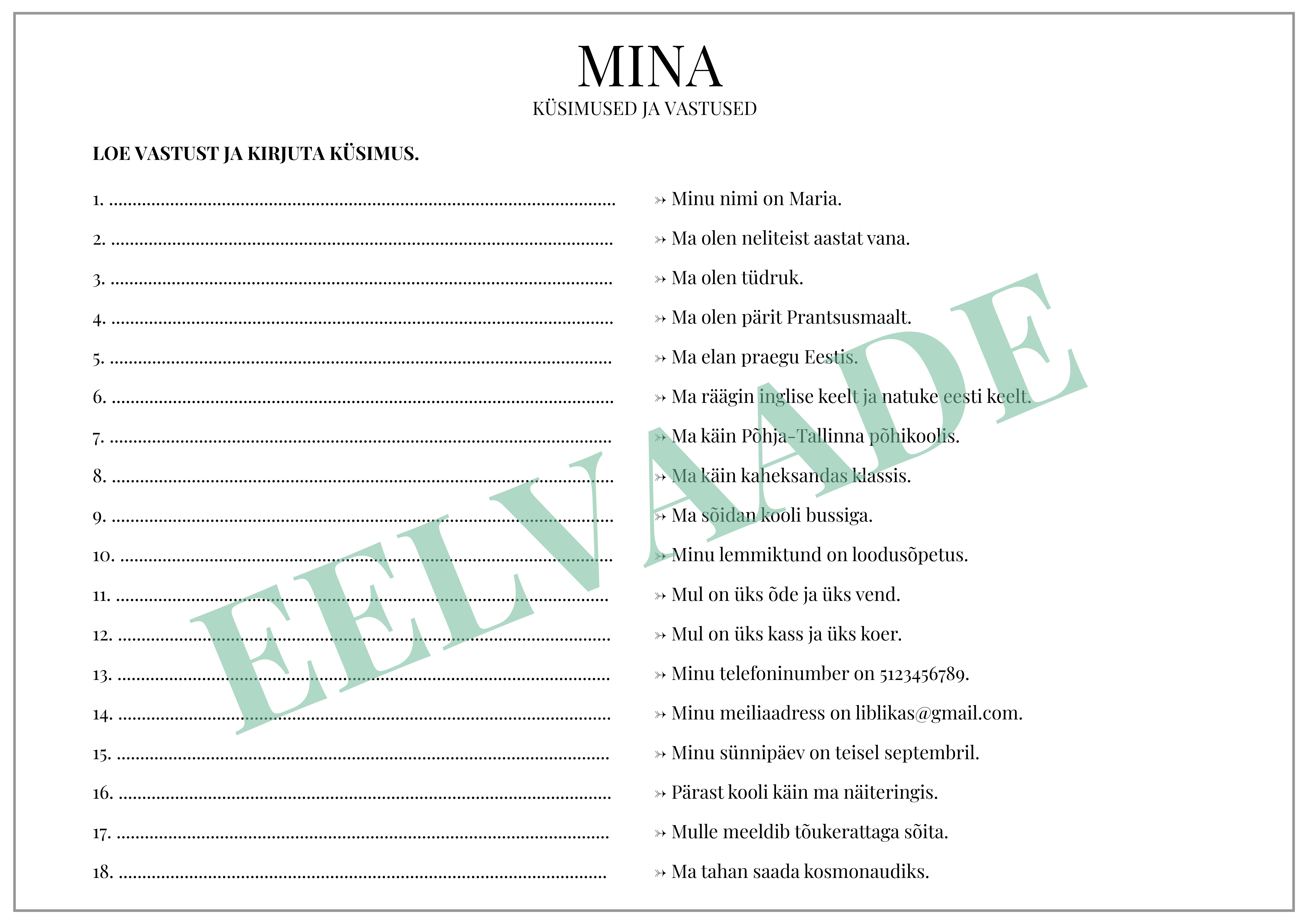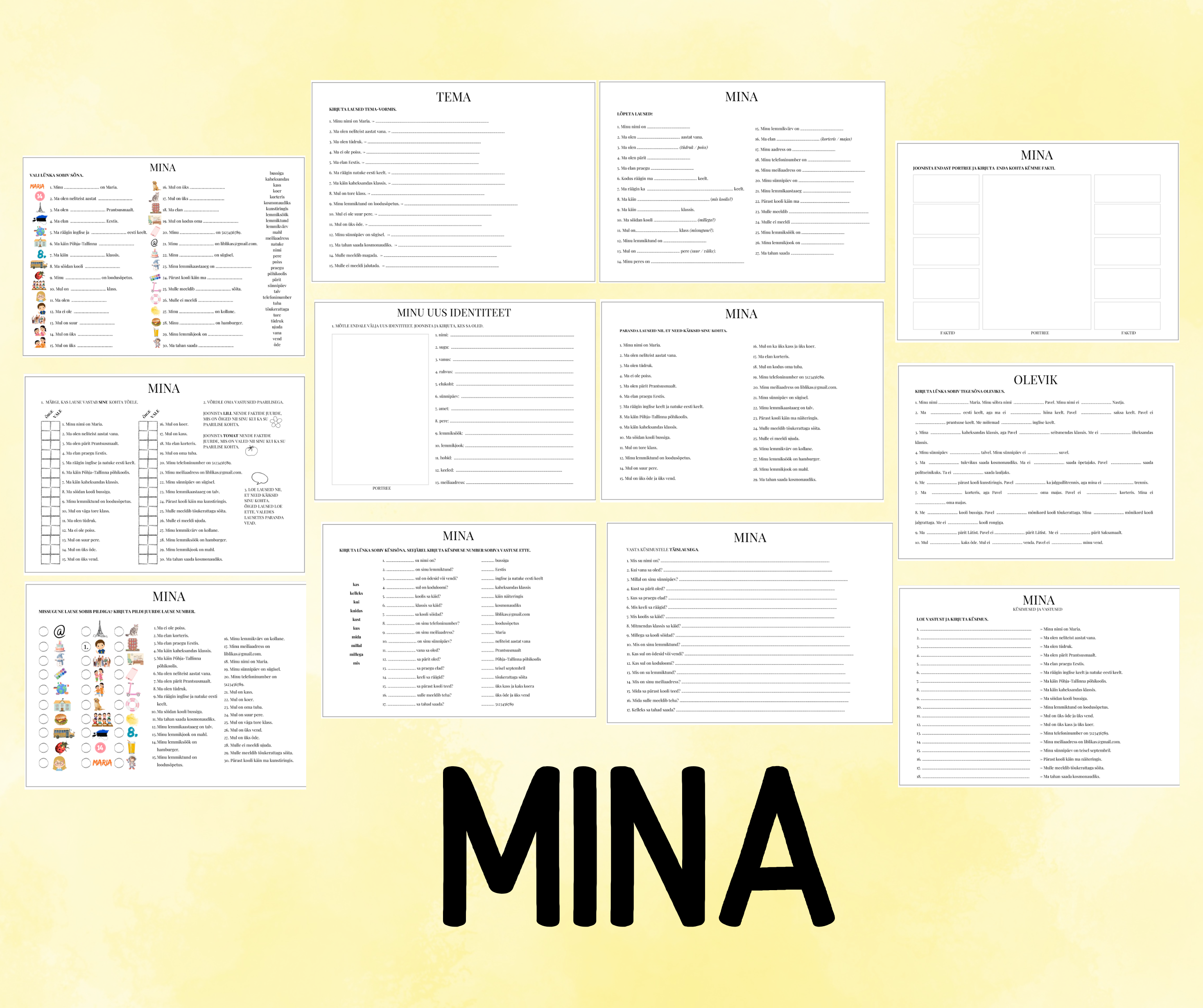 Töölehtede komplekt “Mina” eesti keele teise keelena tundi. Materjali abil saab harjutada endast rääkimist ning kinnistada lausemalle. Lisaks harjutatakse küsimuste esitamist. Kõik töölehed on eelvaatest näha ja neid on võimalik soetada ka üksikult.