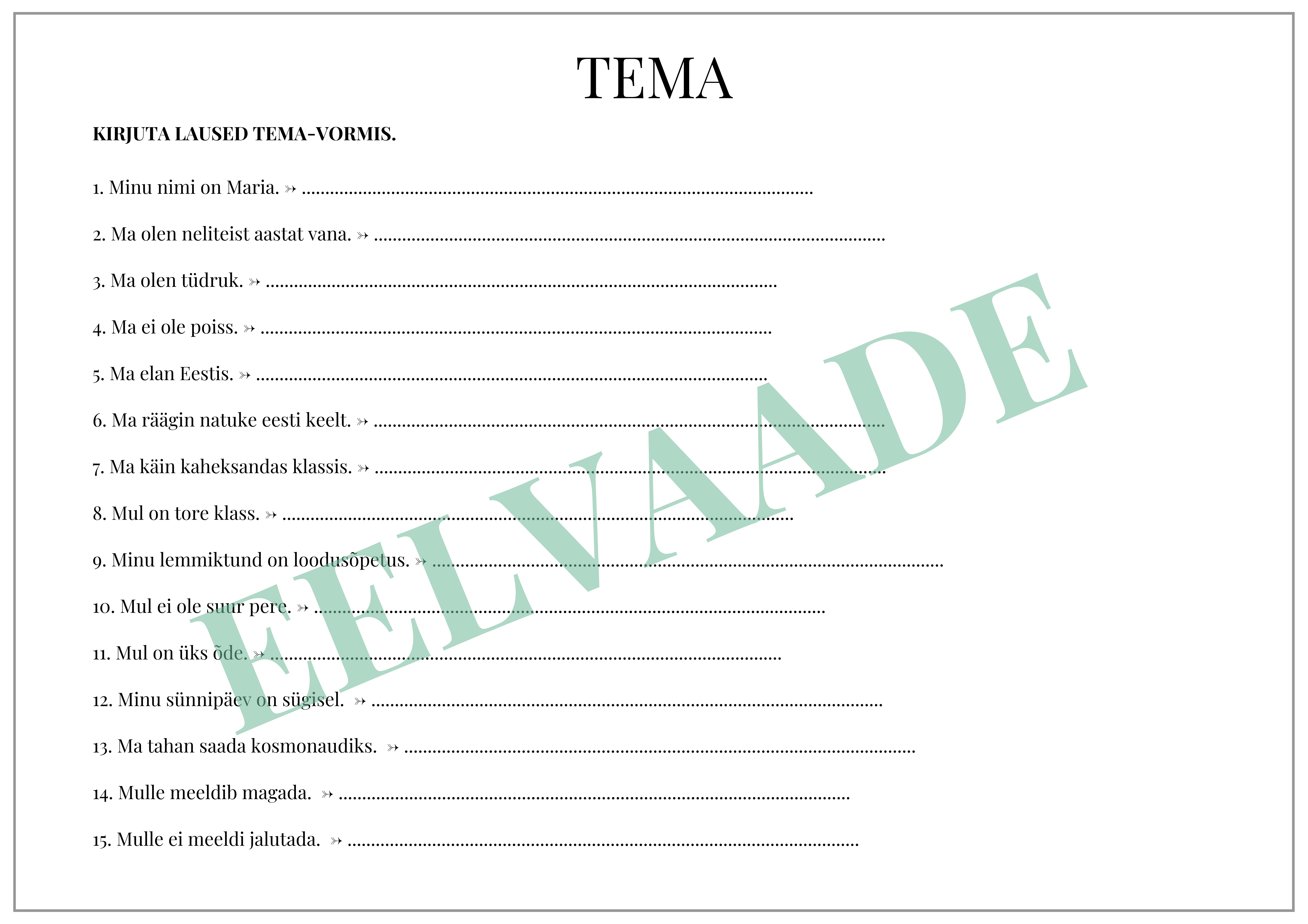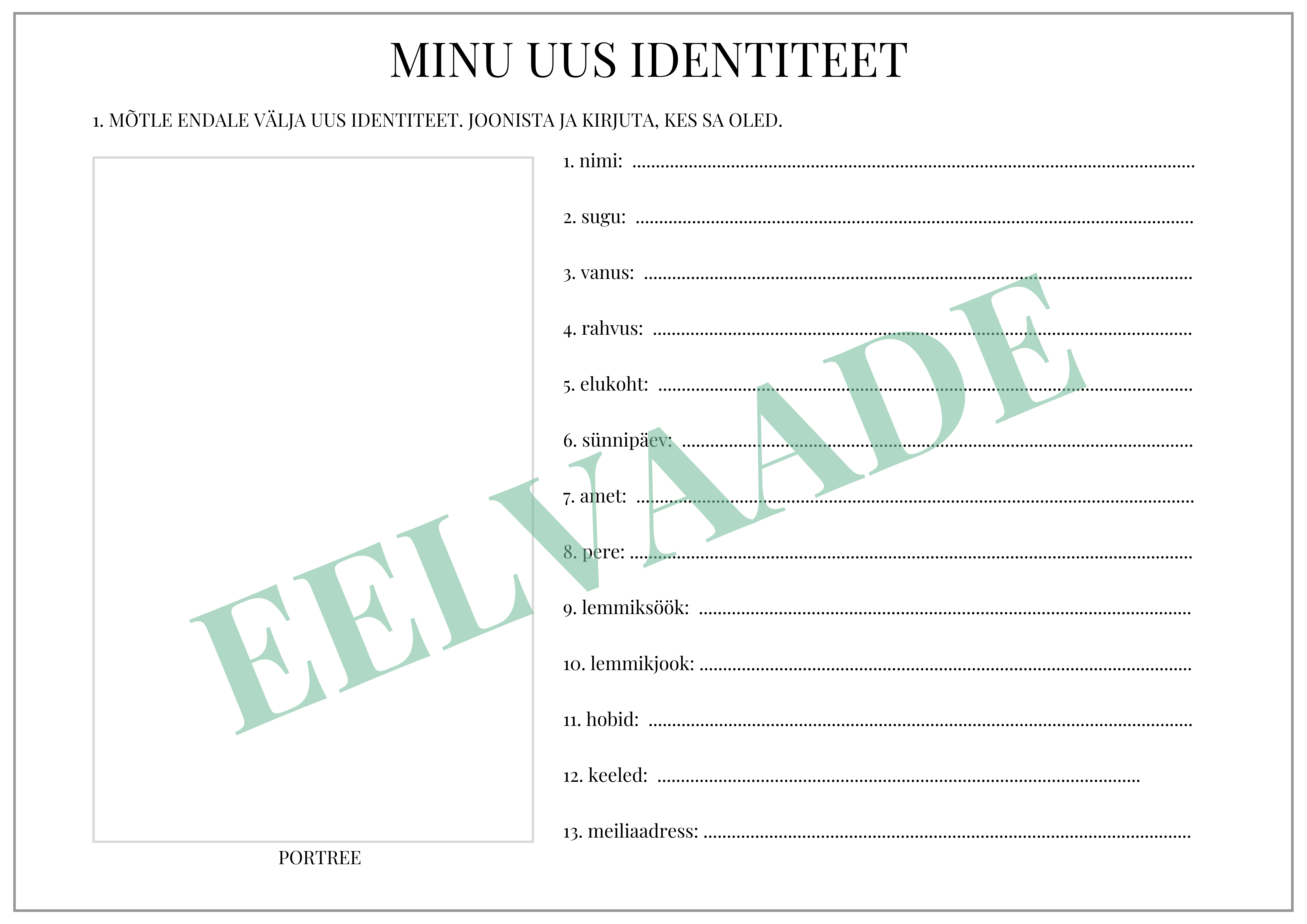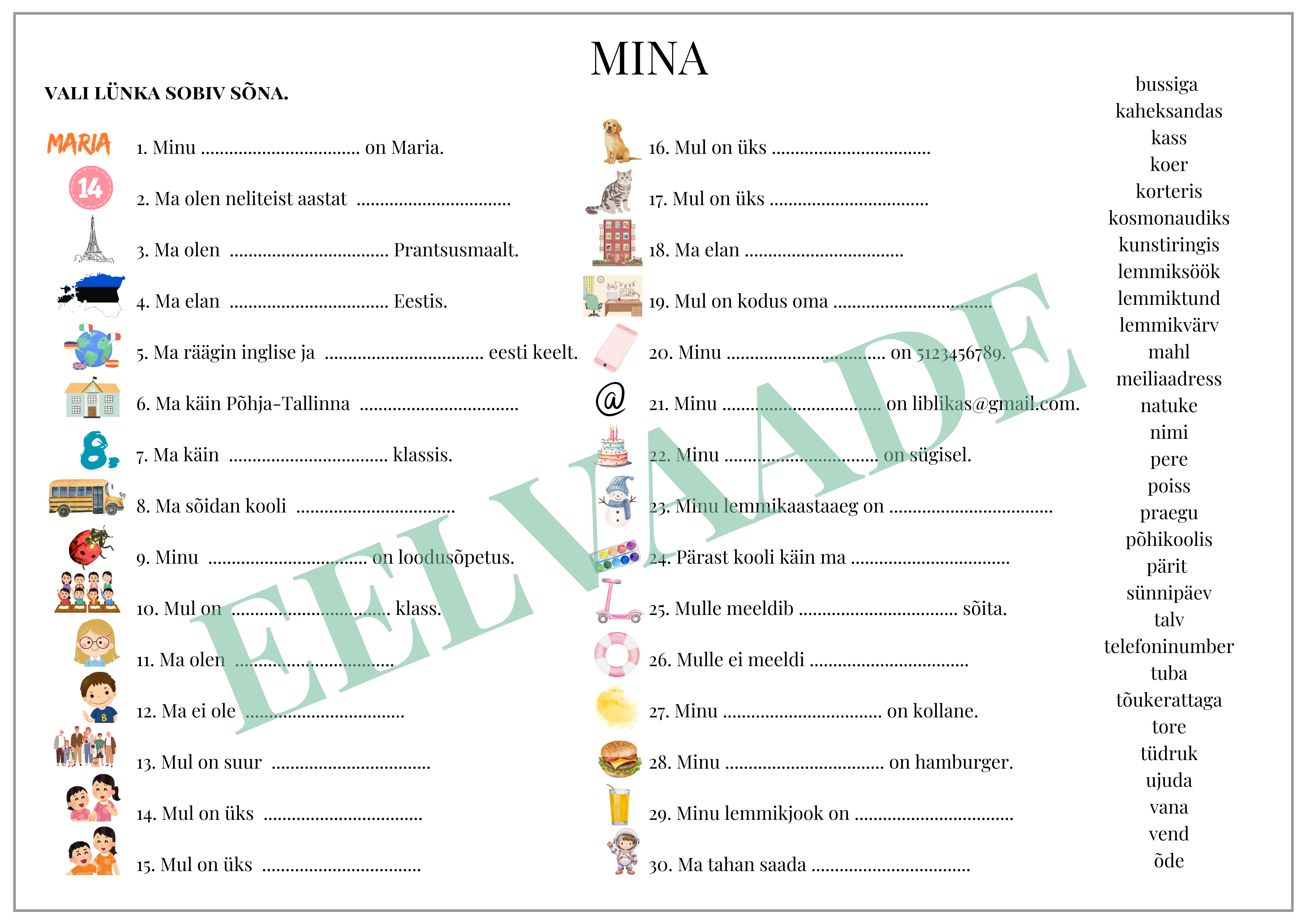 Töölehtede komplekt “Mina” eesti keele teise keelena tundi. Materjali abil saab harjutada endast rääkimist ning kinnistada lausemalle. Lisaks harjutatakse küsimuste esitamist. Kõik töölehed on eelvaatest näha ja neid on võimalik soetada ka üksikult.