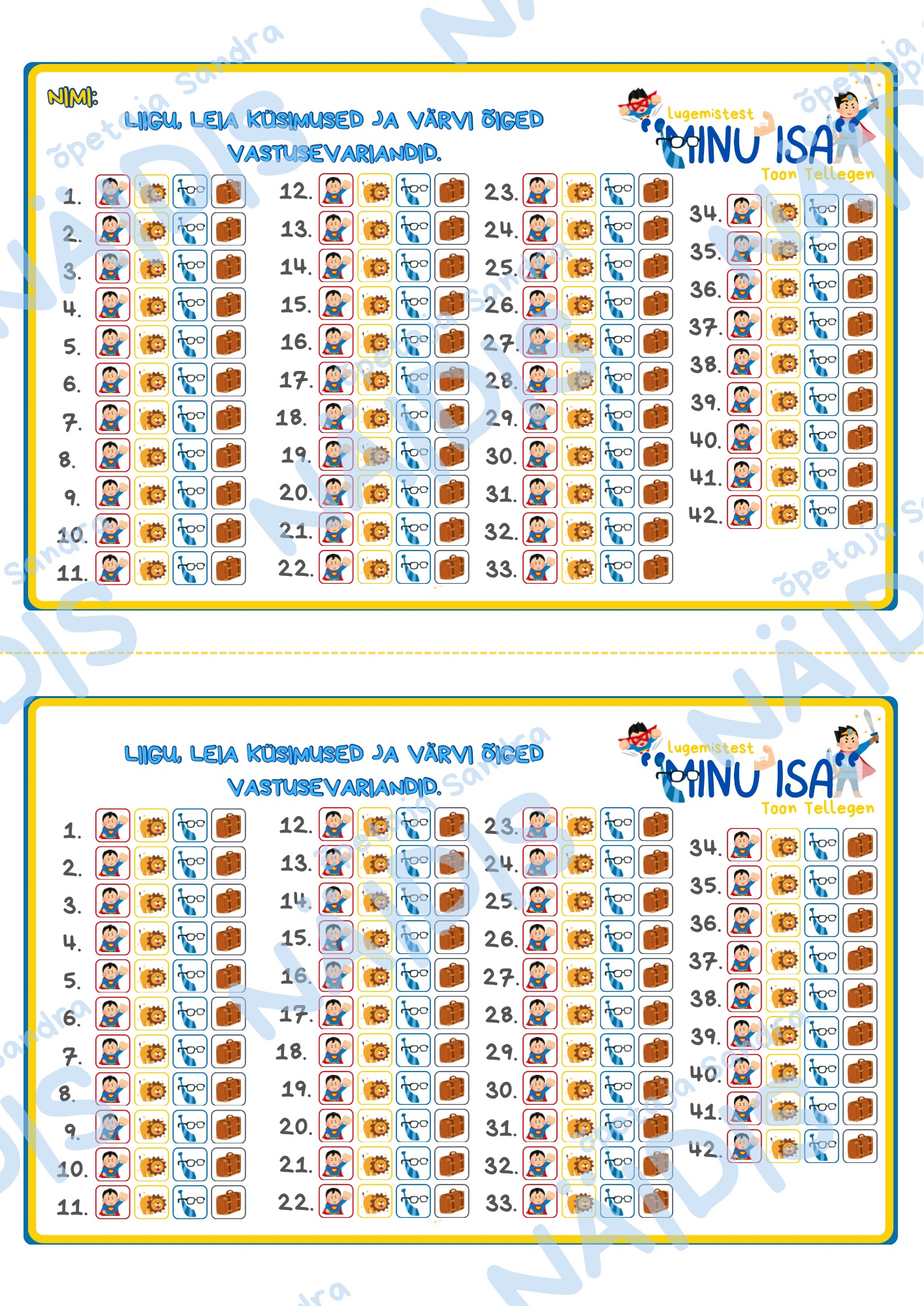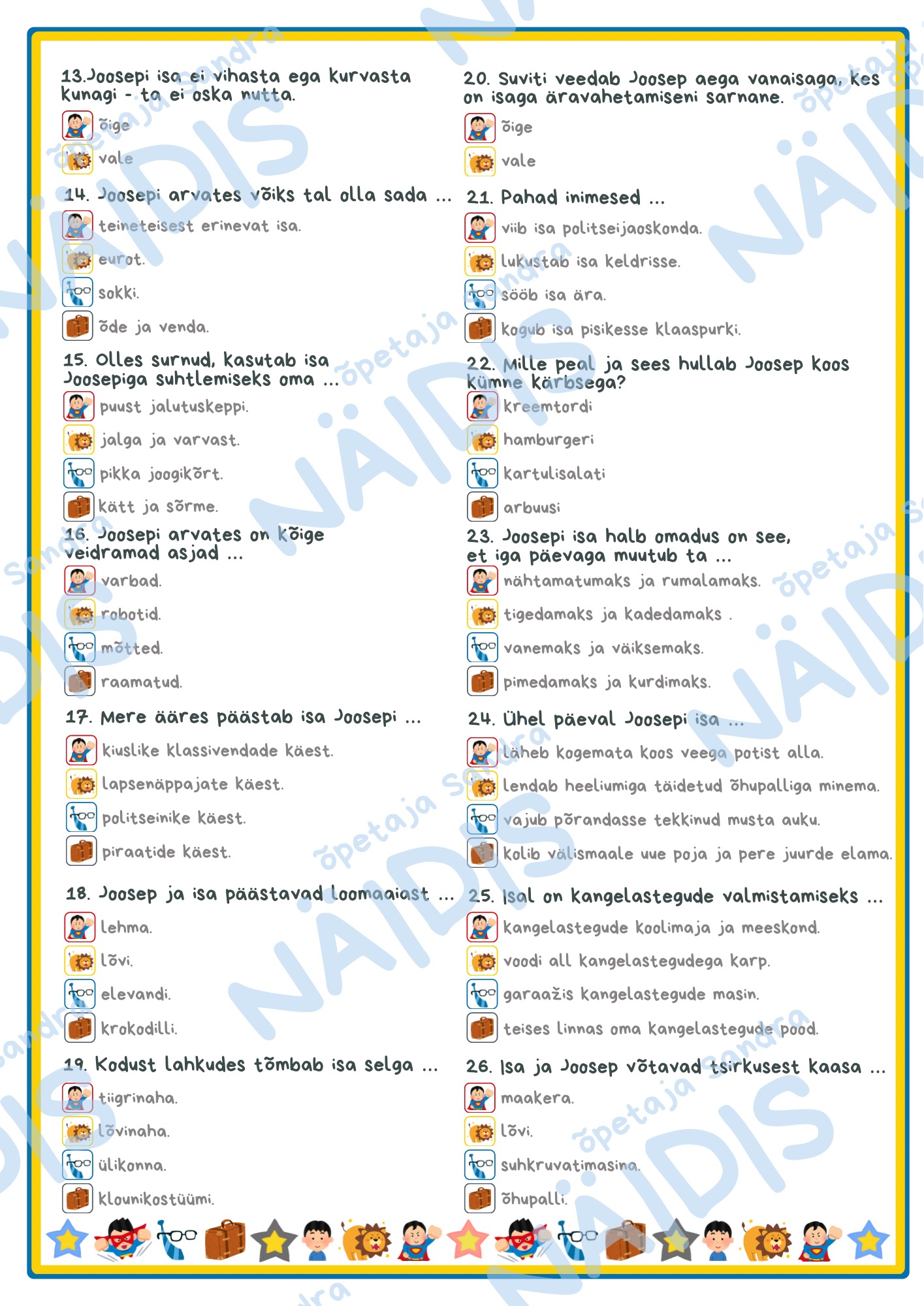 📝 Lugemistest-töölehtede kogumik koosneb kahest kahepoolselt täidetavast töölehest (42 sisulist mõistmist kontrollivat ja 2 loovus- ning empaatiavõimet arendavat küsimust) + samasisulised seintele kinnitatavad küsimustekaardid vastustelehega.