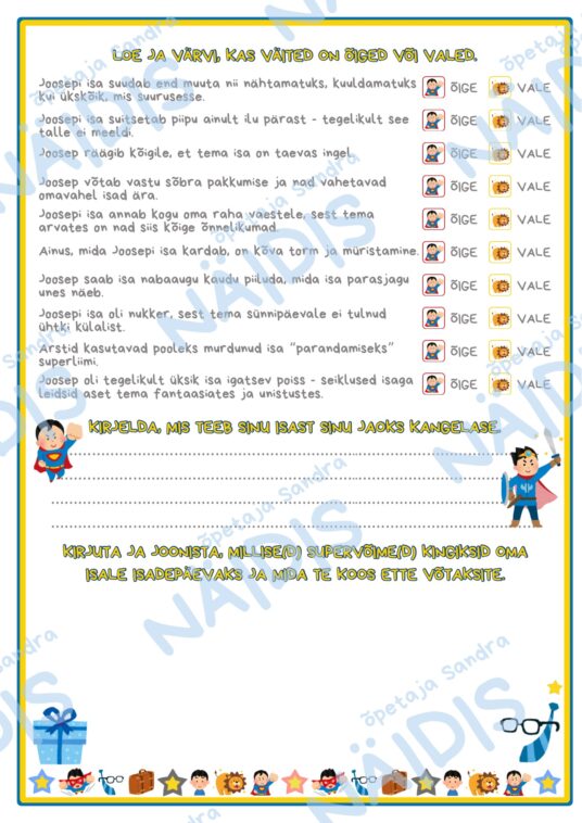 🦸🏻♂️ loovus- ja empaatiavõime arendamiseks kirjutada ja joonistada, mis teeb tema isast tema jaoks superkangelase ning millised supervõimed ta oma isale isadepäevaks kingiks.