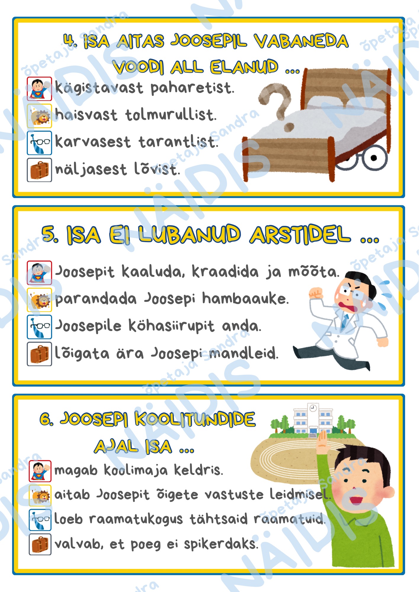 📝 Lugemistest-töölehtede kogumik koosneb kahest kahepoolselt täidetavast töölehest (42 sisulist mõistmist kontrollivat ja 2 loovus- ning empaatiavõimet arendavat küsimust) + samasisulised seintele kinnitatavad küsimustekaardid vastustelehega, mille täitmise käigus tuleb õpilasel: