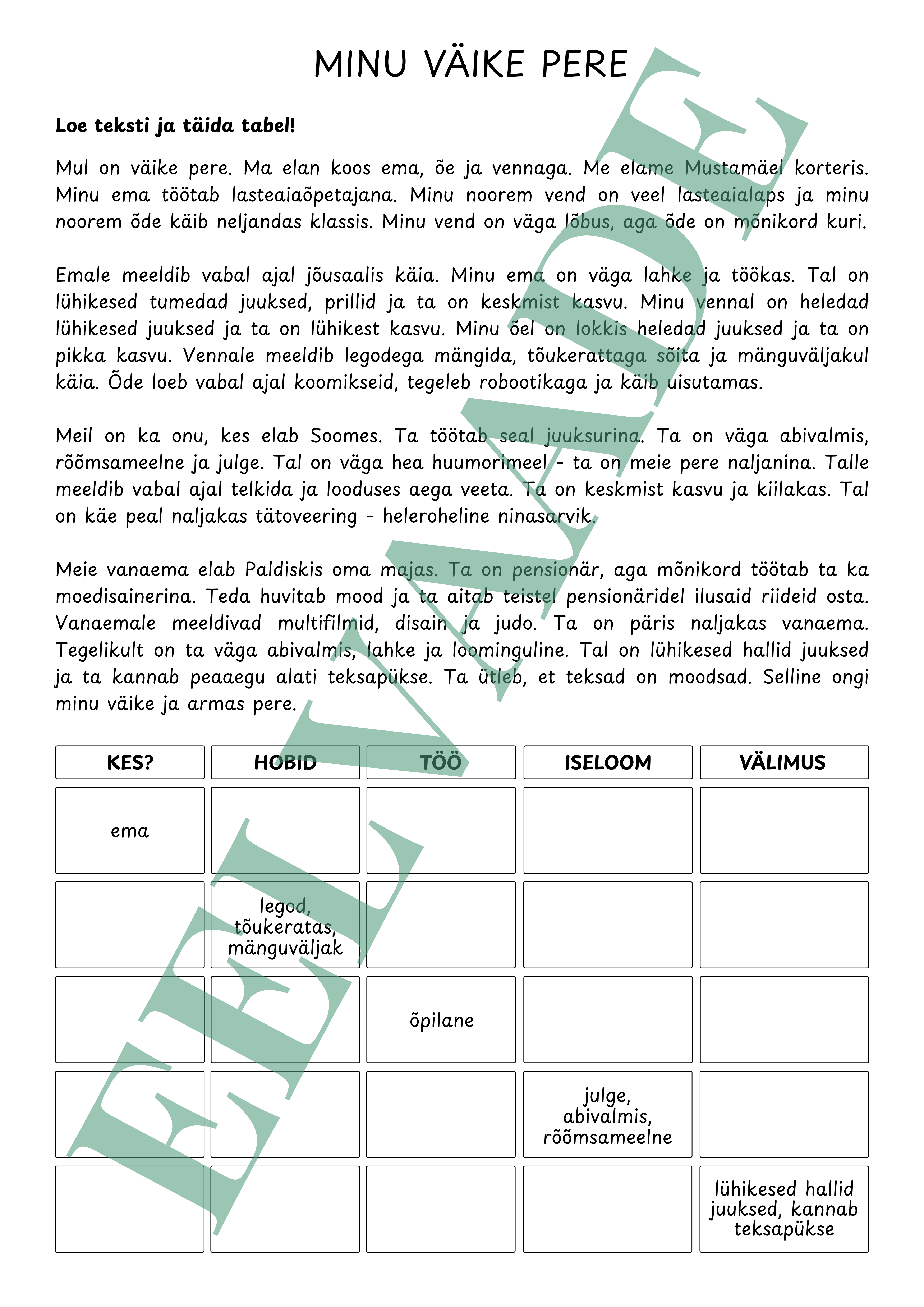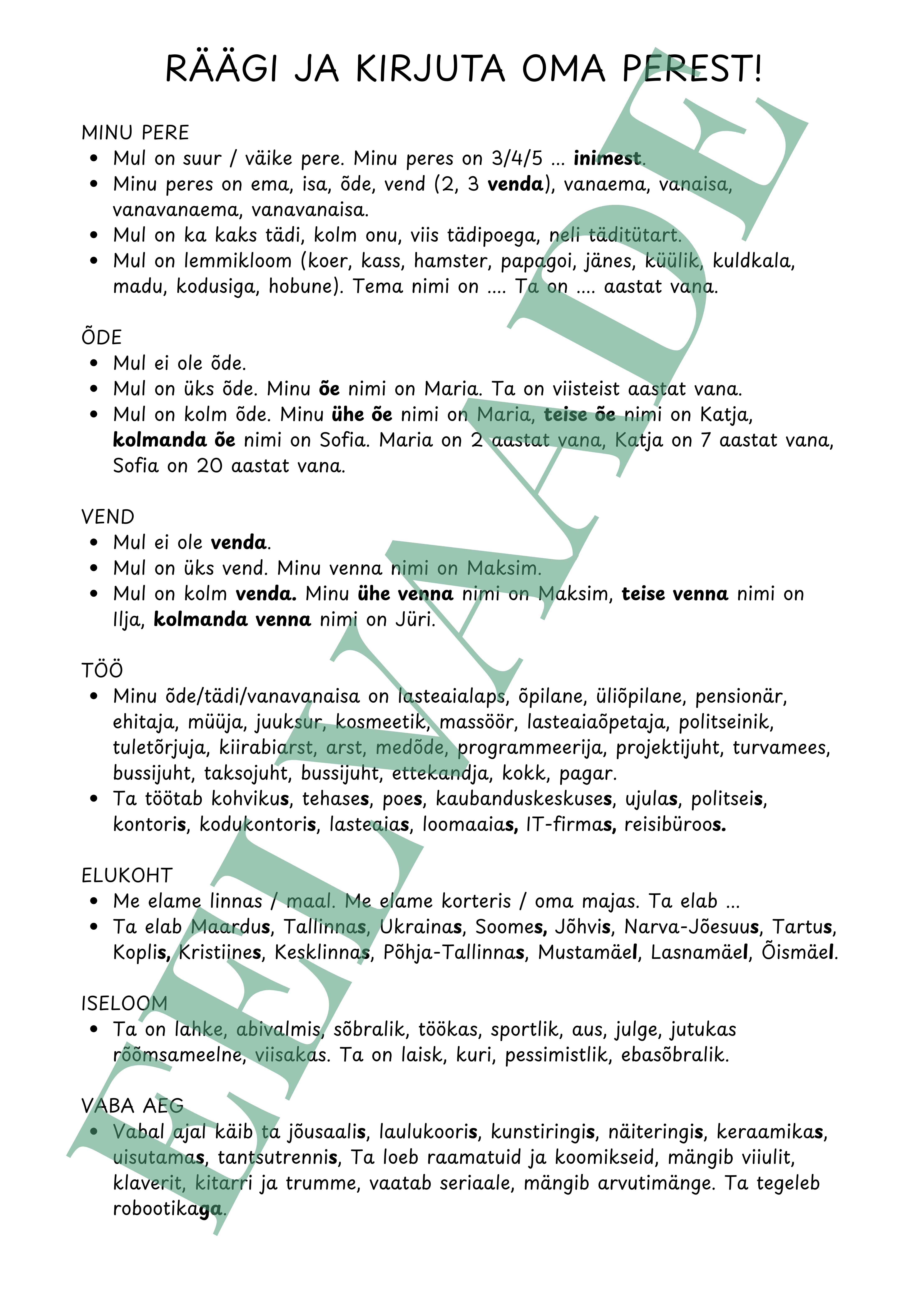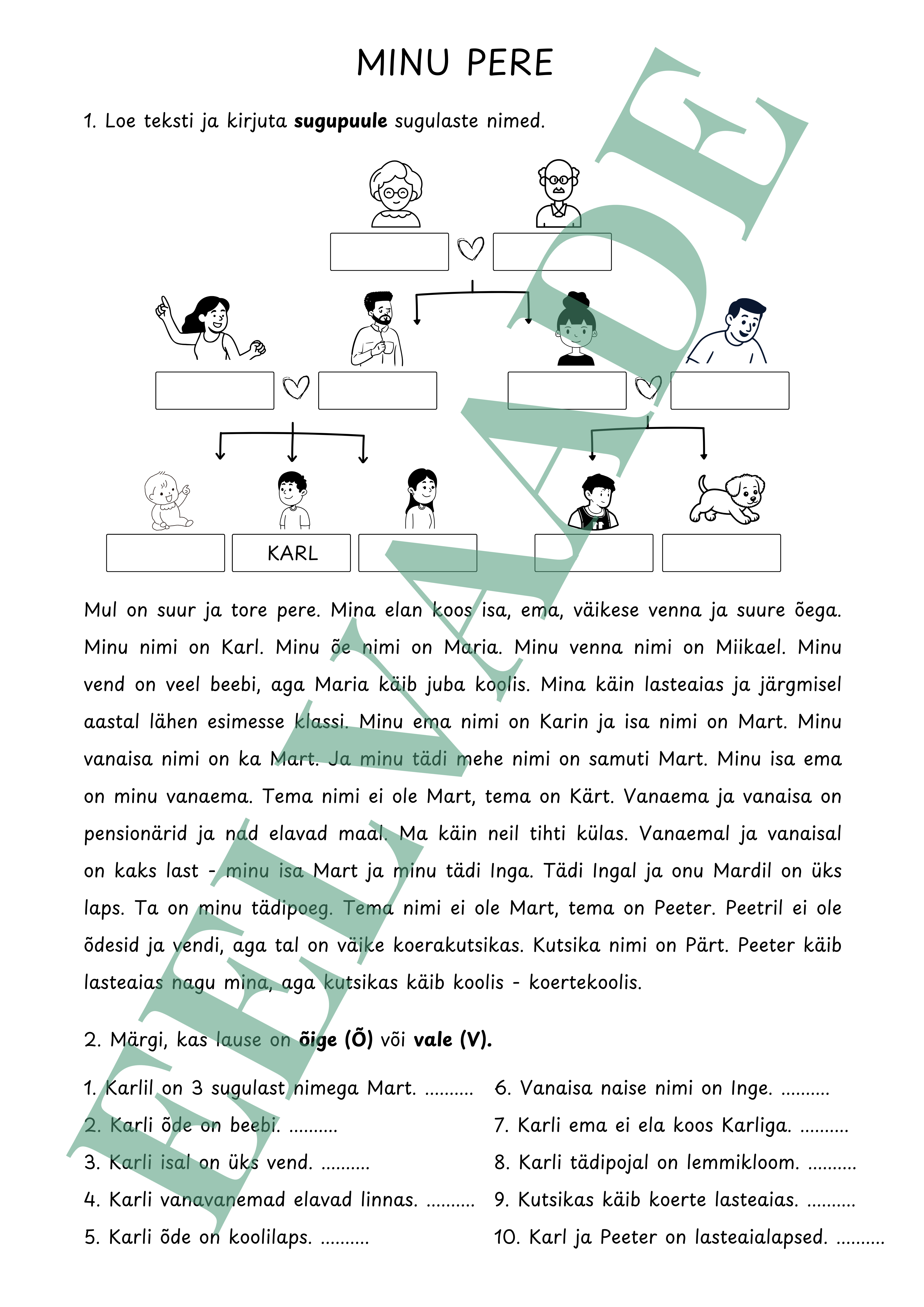 22 lehekülge töölehti PERE JA SUGULASTE kohta. Lugemine, sõnavara, grammatika, rääkimine, kirjutamine.