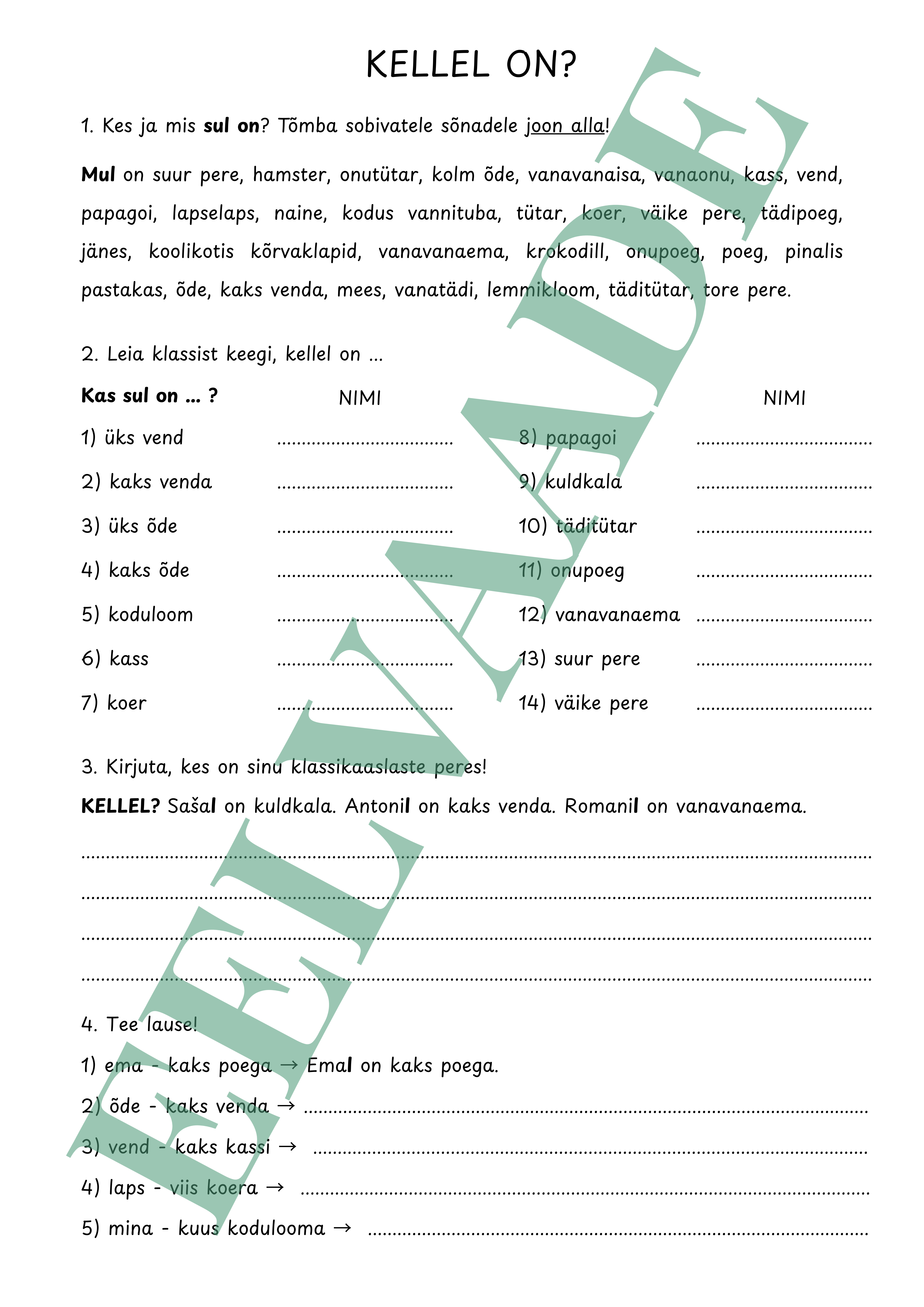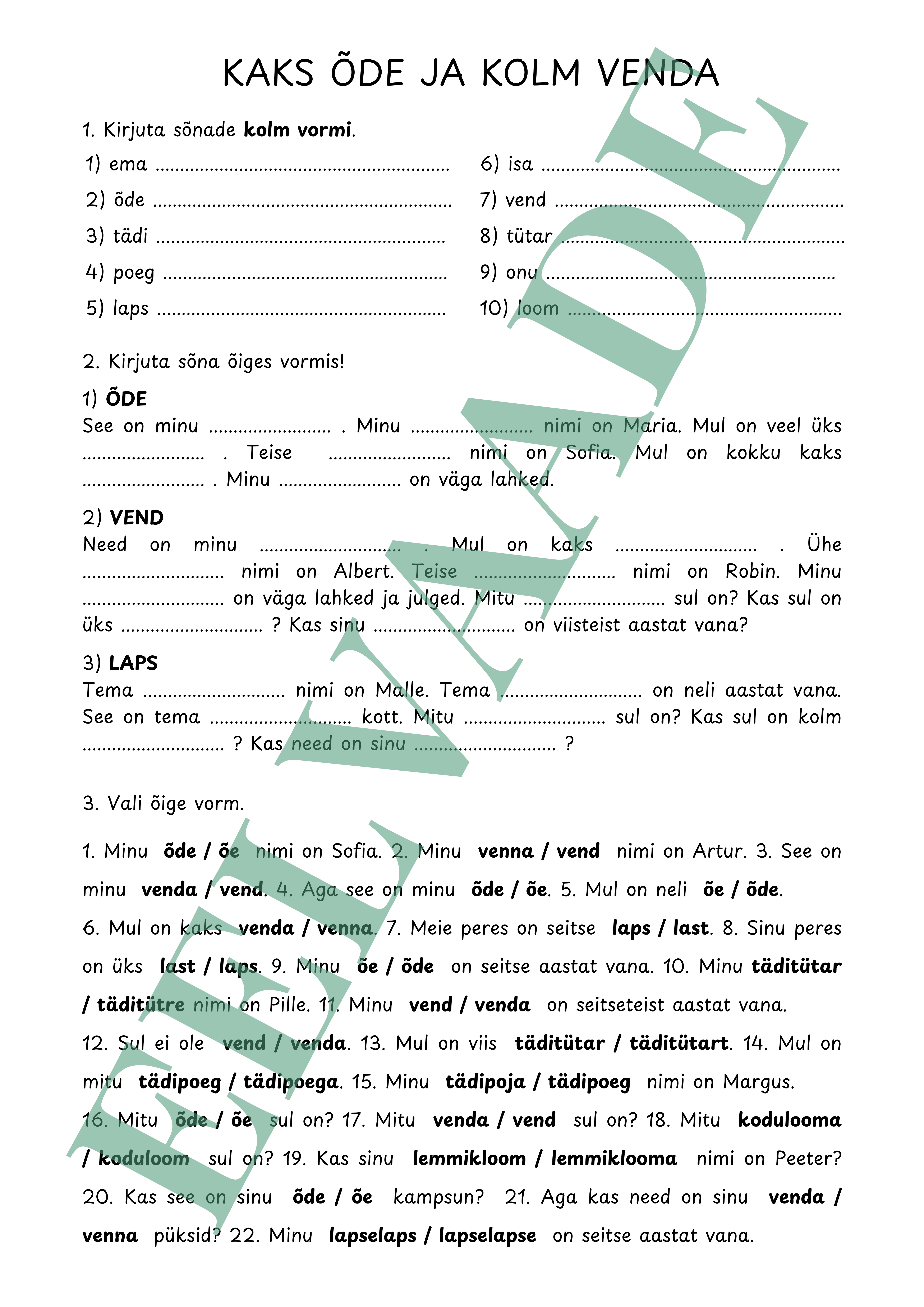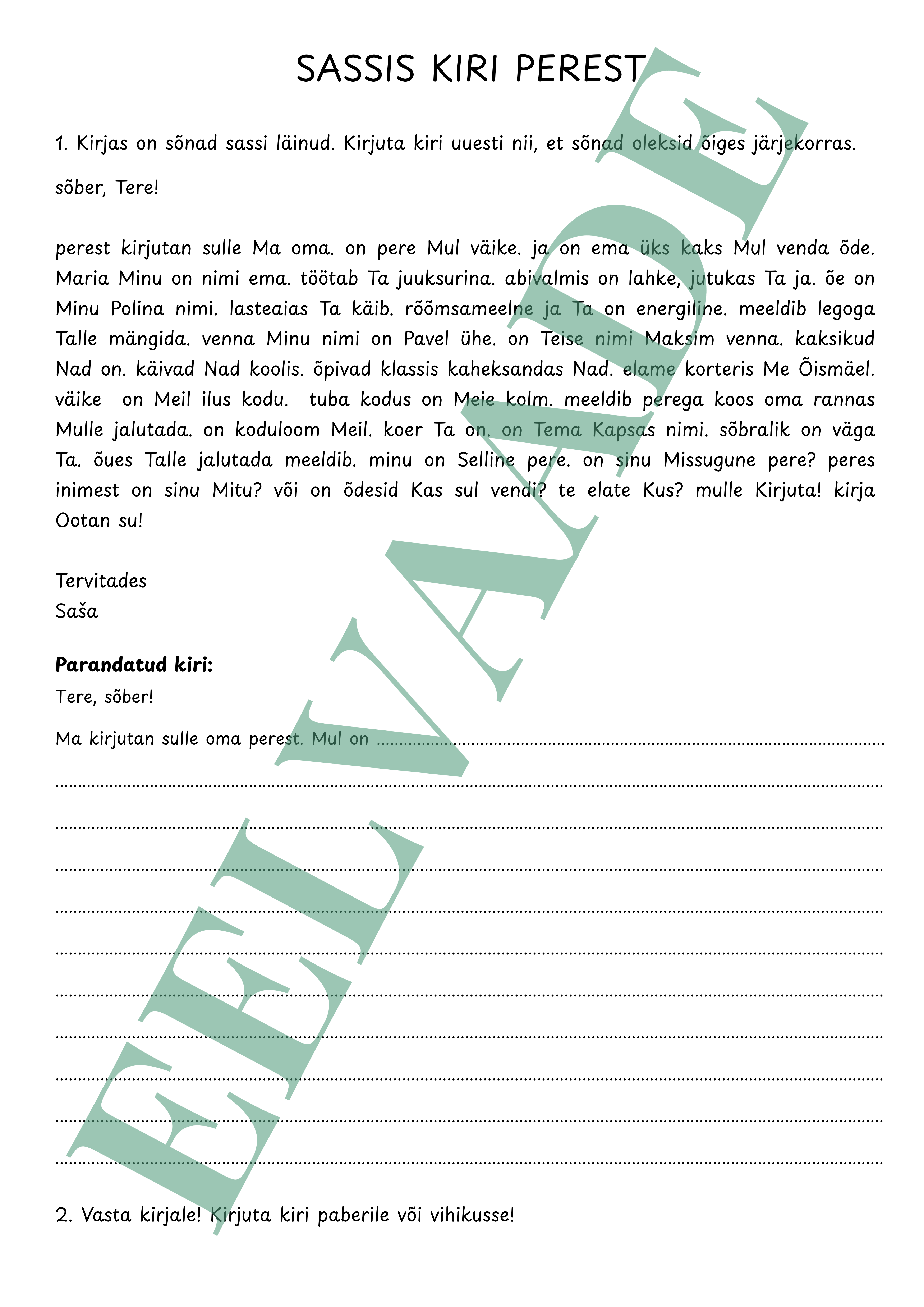 22 lehekülge töölehti PERE JA SUGULASTE kohta. Lugemine, sõnavara, grammatika, rääkimine, kirjutamine.