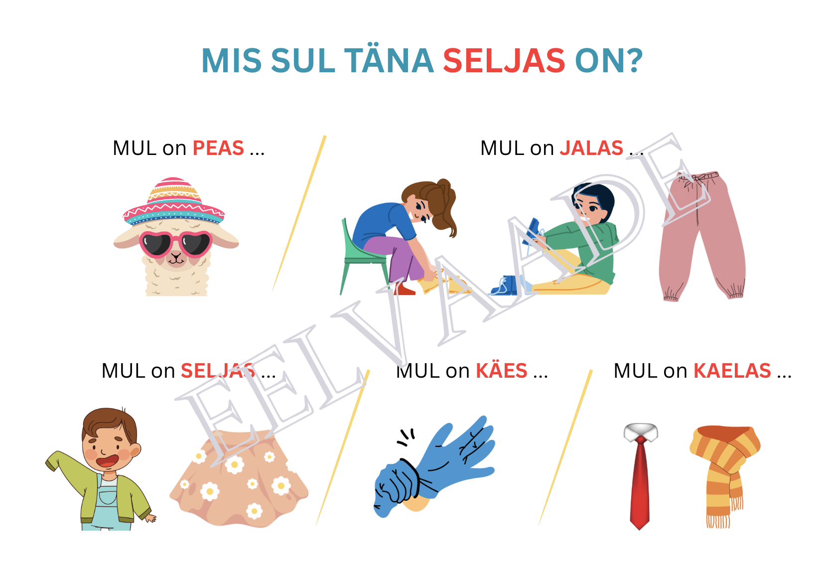 Väike abivahend jutustamaks, mis on peas, seljas, jalas, käes, kaelas. Sobib ka plakatiks klassi seinale.