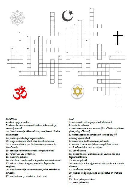 Kaks ersinevat ristsõna, mis on koostatud 6.klassi õpiku MOSAIIK peatüki “Missugused on levinumad usundid maailmas?” teksti põhjal.