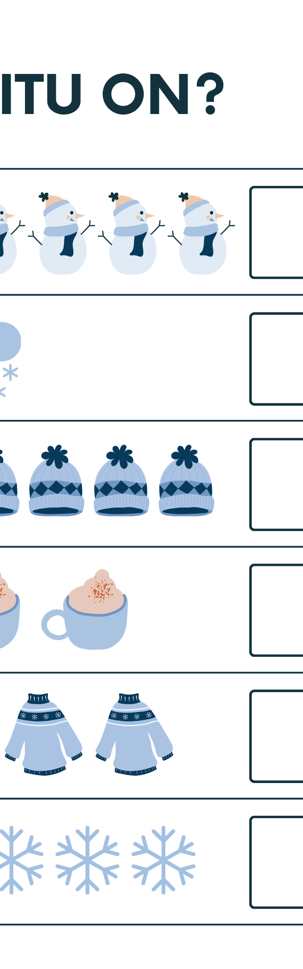 Ostja saab ühe lehe. Laps loendab pildil olevad talvega seotud sõnad ja kirjutab ruutu õige arvu.