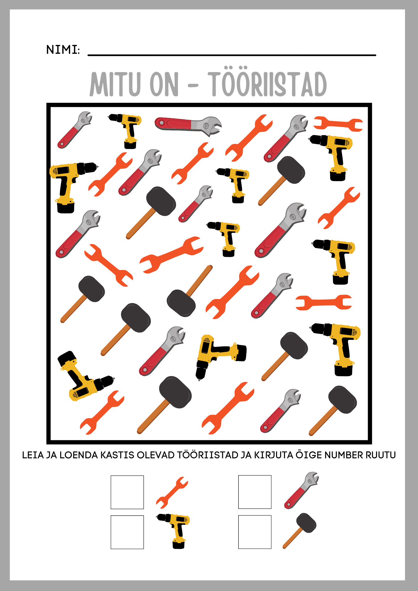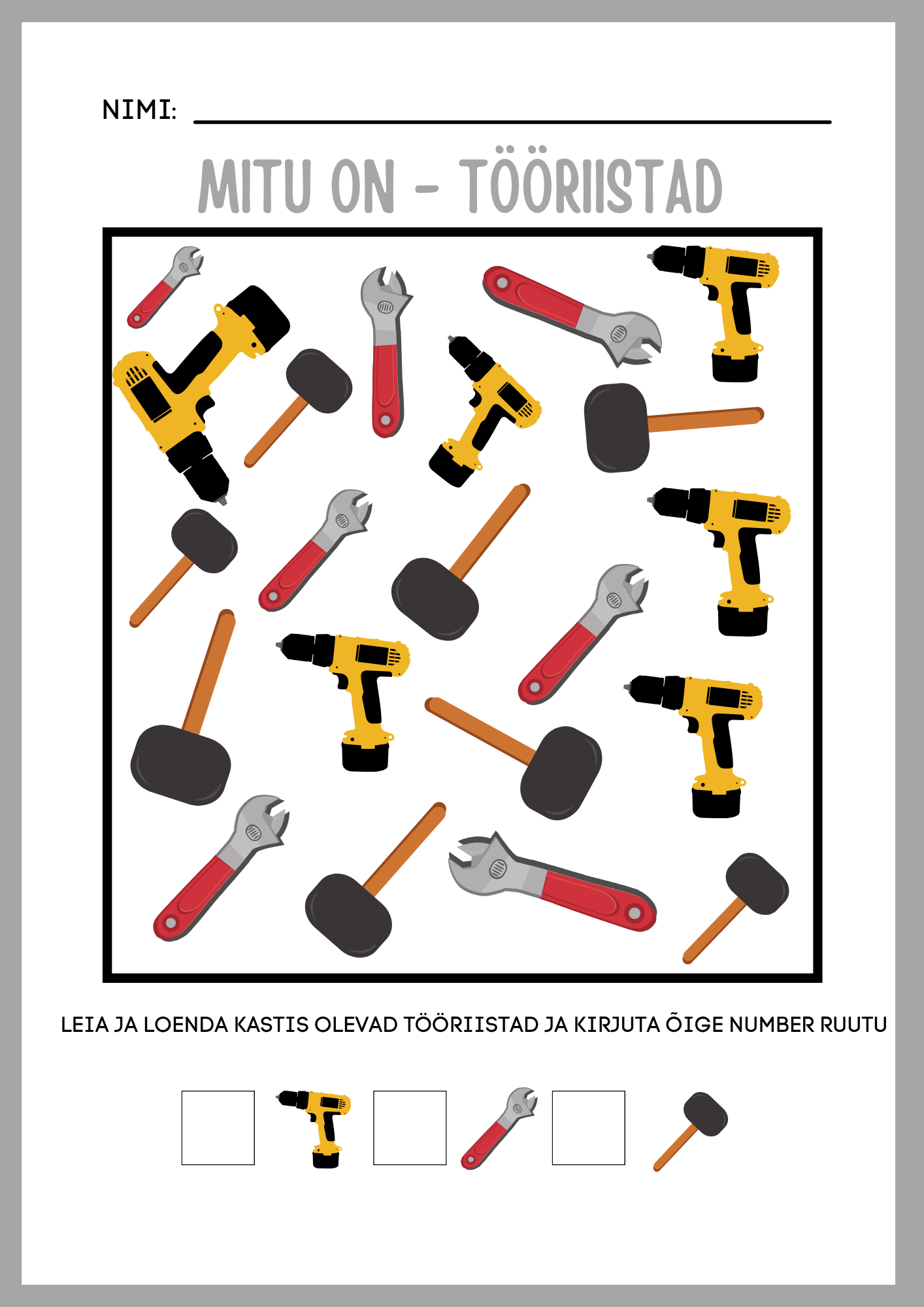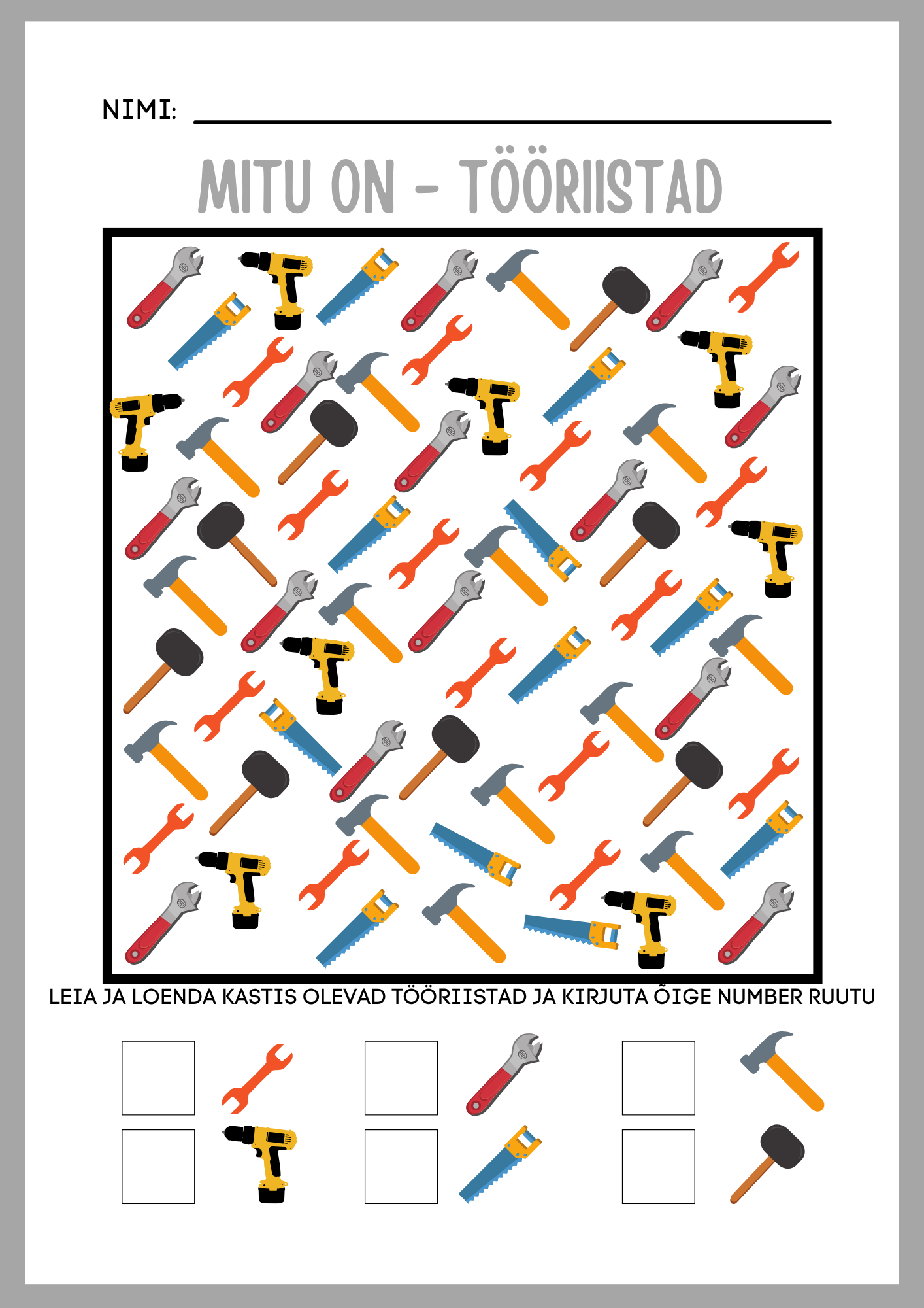 LAPS PEAB KOKKU LOENDAMA ERINEVAD TÖÖRIISTAD JA TÖÖRIISTA JUURES OLEVASSE RUUTU ÕIGE ARVU KIRJUTAMA. KOKKU ON 3 ERINEVA RASKUSASTMEGA TÖÖLEHTE.