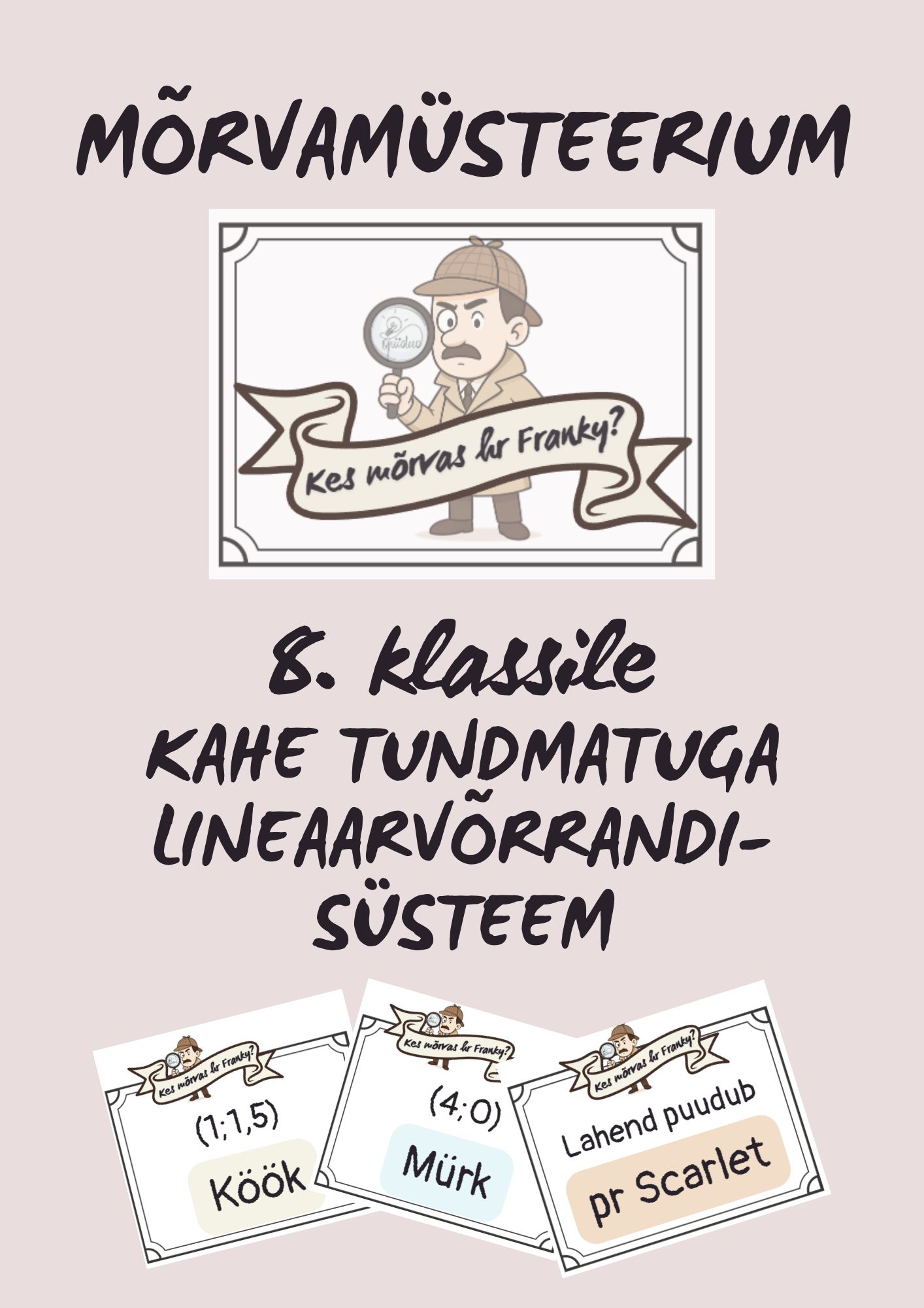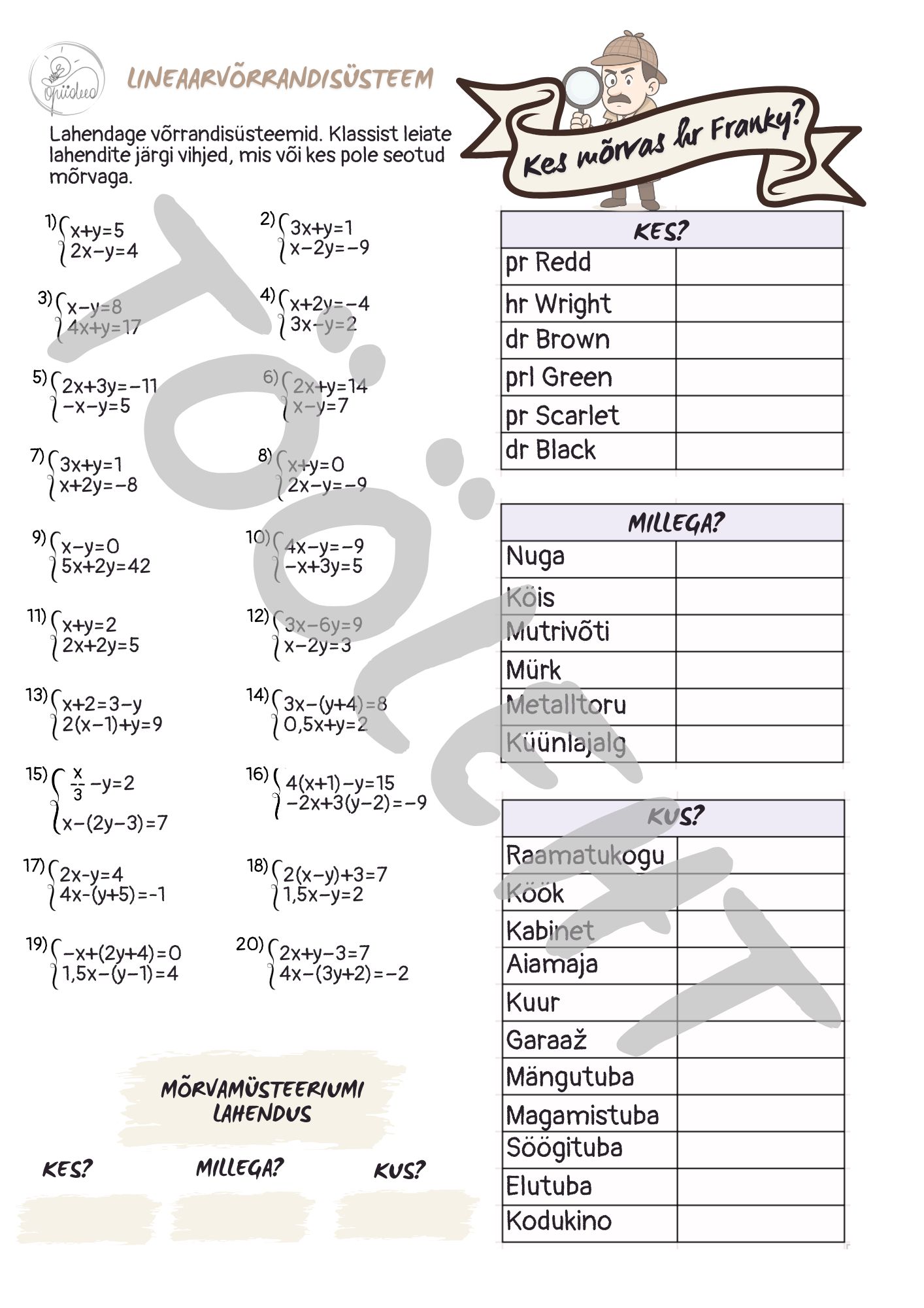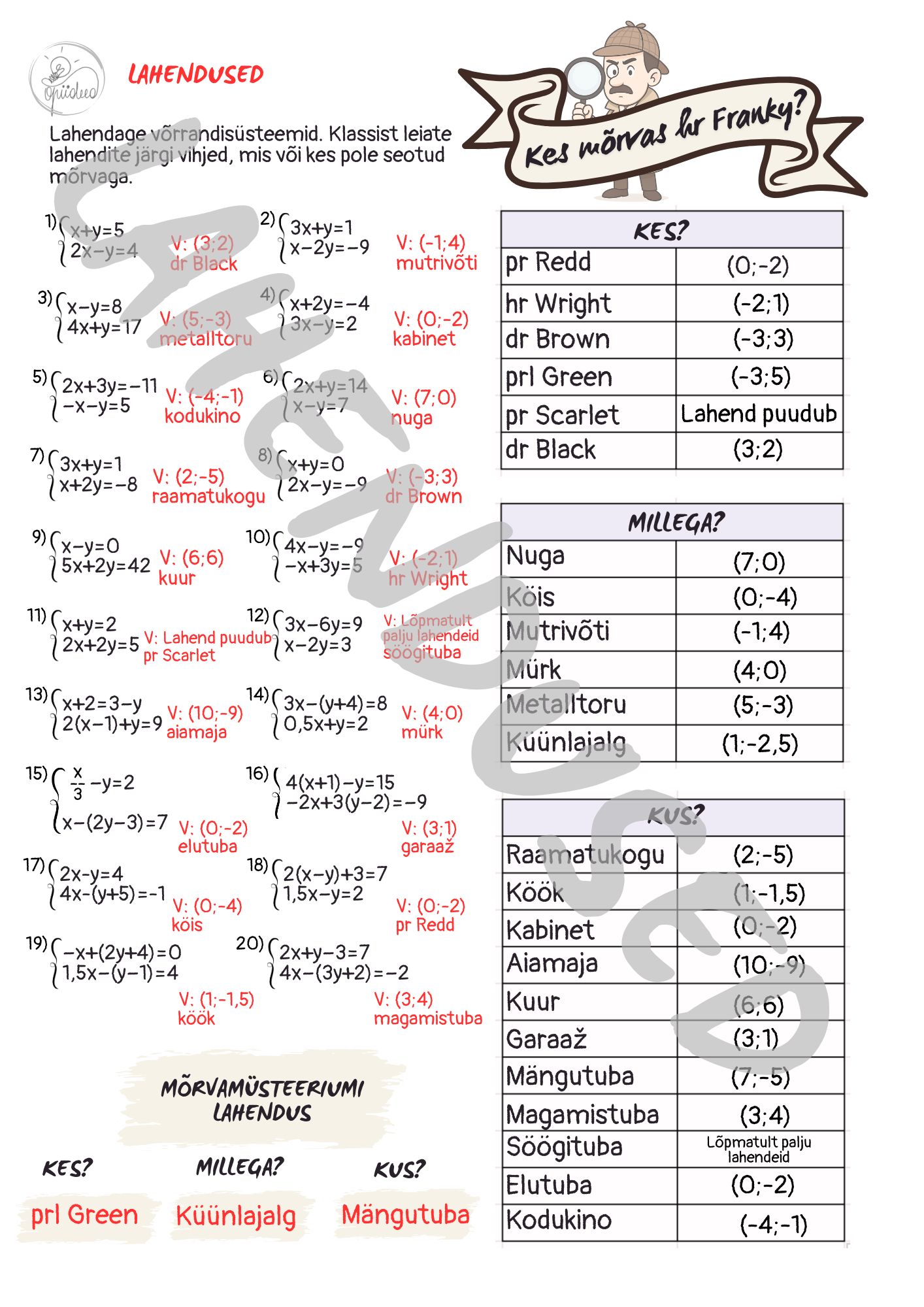 - töölehel on 20 võrrandisüsteemi ja tabel, kus kirjas kahtlusalused, võimalikud mõrvapaigad ja -relvad;