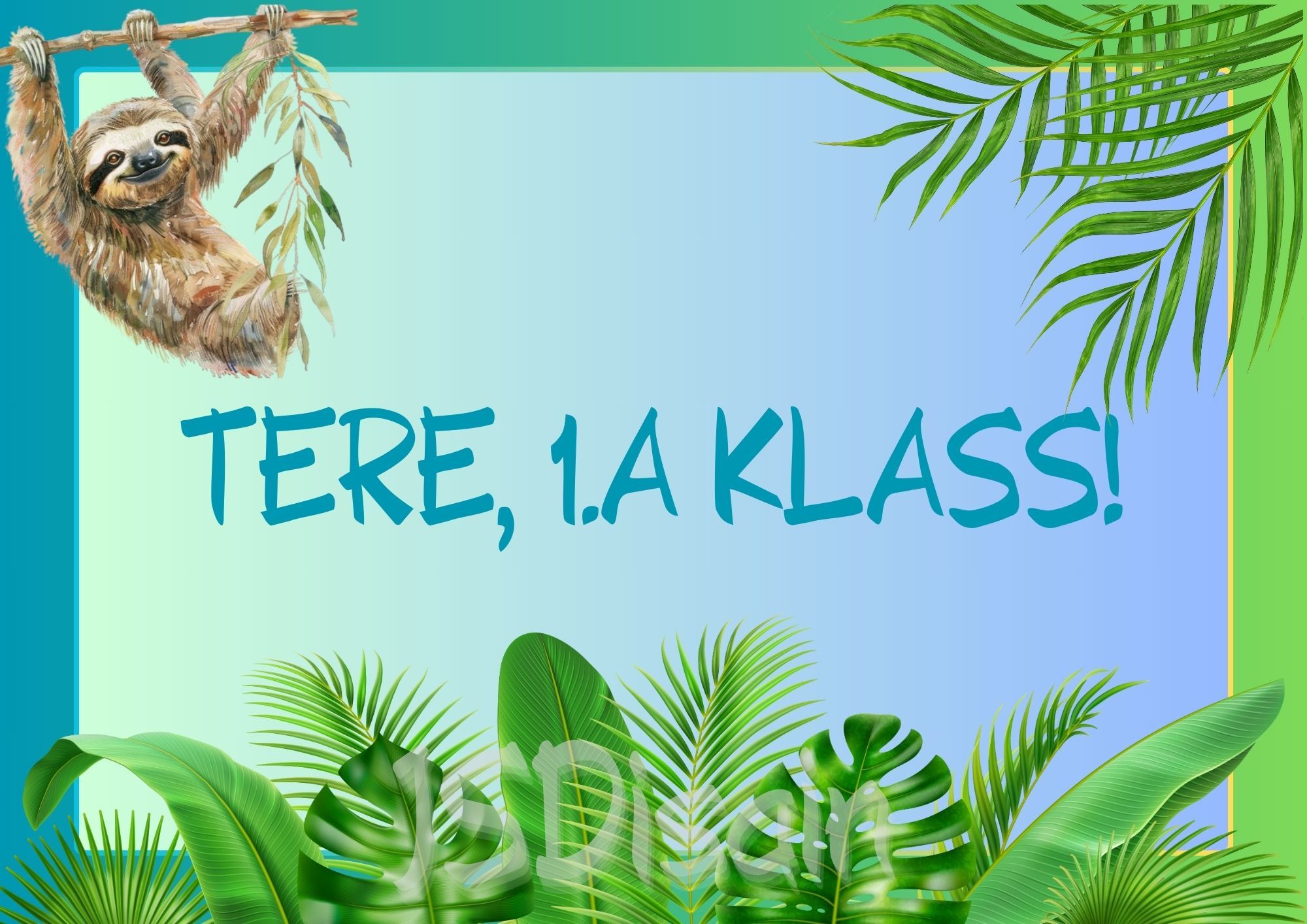 A4 formaadis uksesilt kirjaga “TERE 1. A KLASS!”. Uksesilt tuleb Canva lingina (link pdf failis), mida saab ise muuta (n. klassi numbrit, tähte jne).
