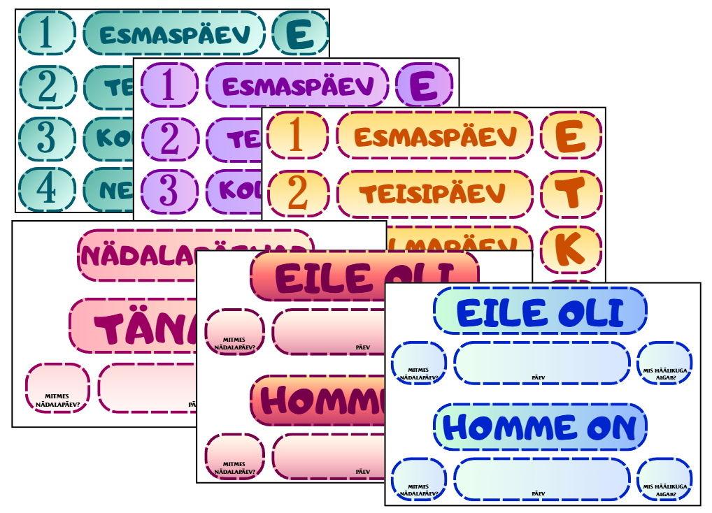 Nädalapäevade sedelid+ numbrid, algushäälikud. Lisaks sedelid “Täna on”, “Eile oli”, “Homme on”. Kõiki sedeleid on kolmes erinevas toonis.