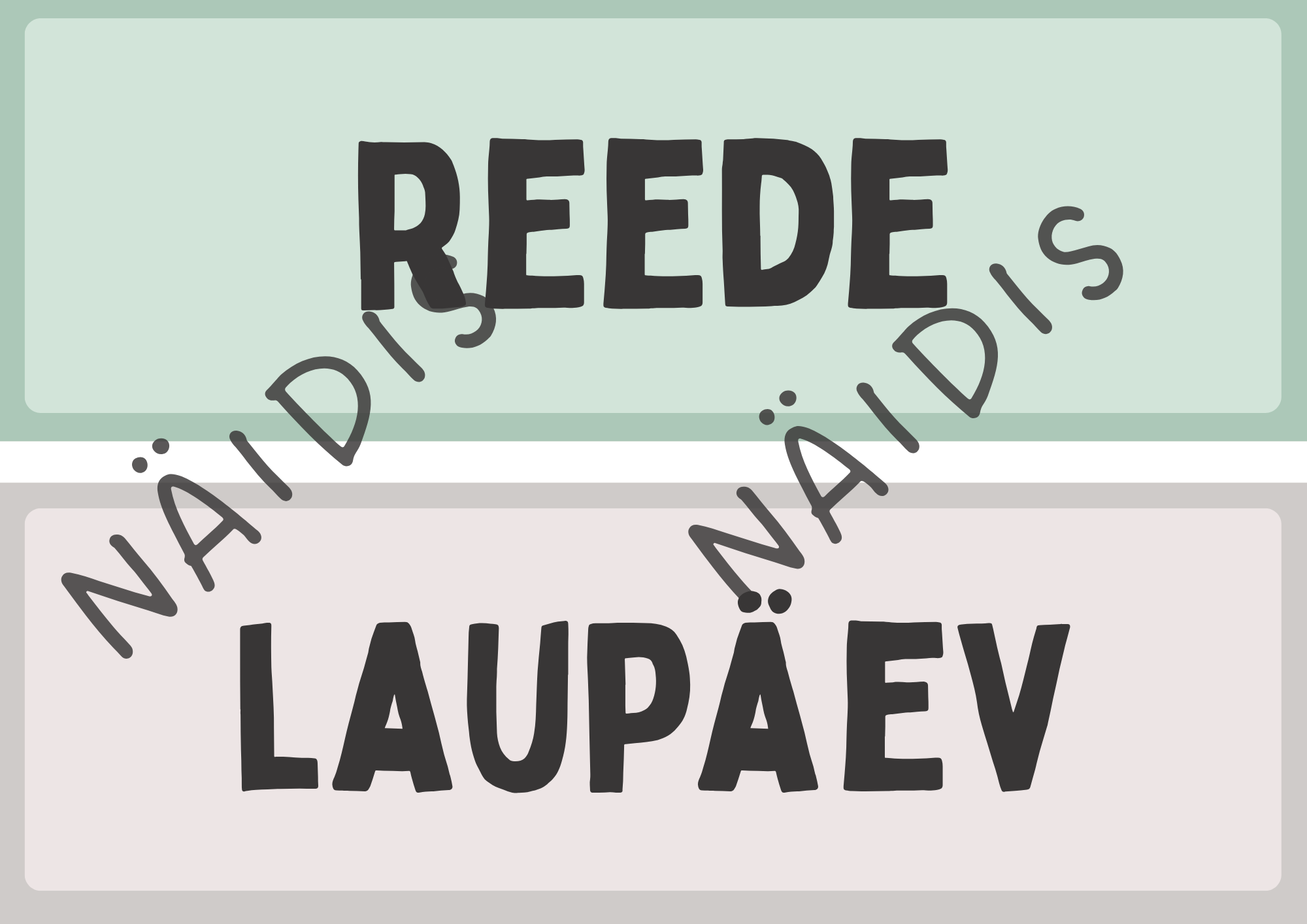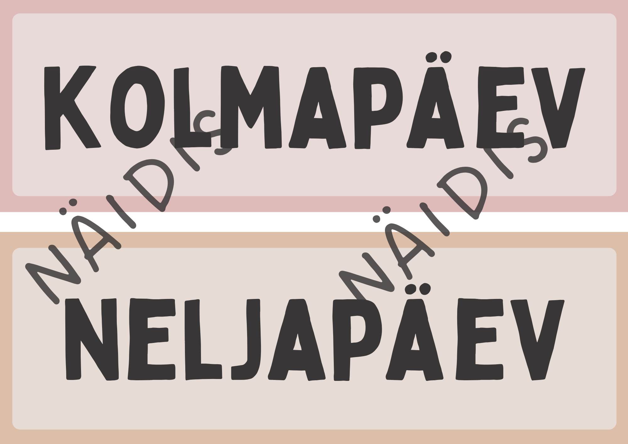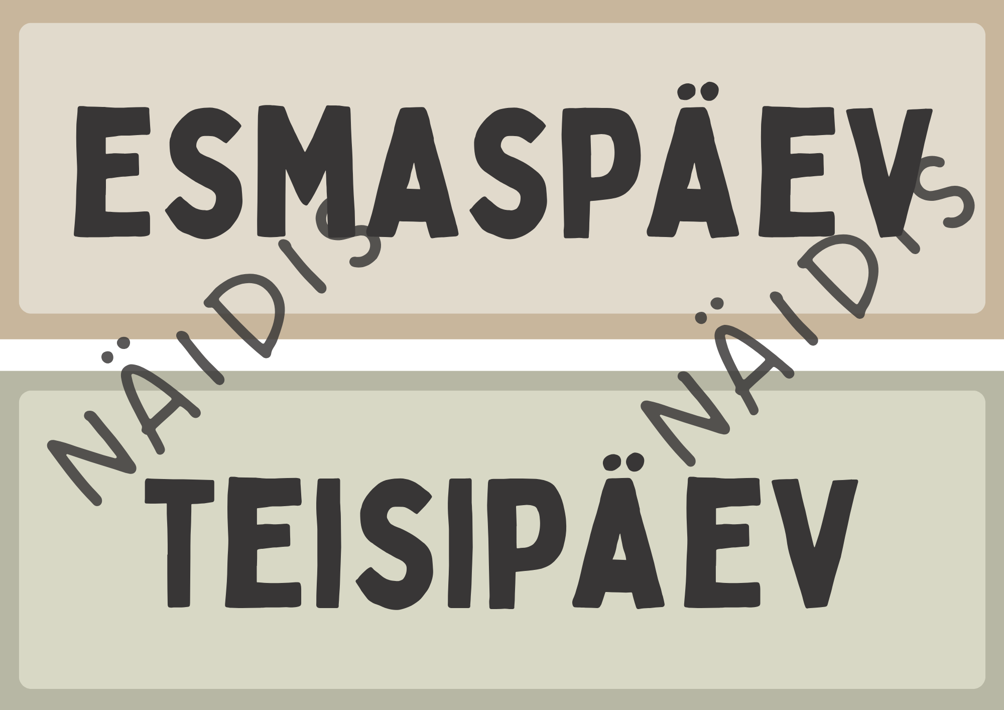 Nädalapäevade sildid. Õpetaja saab sildid lamineerida ja kinnitada tahvlile või klassi seinale.