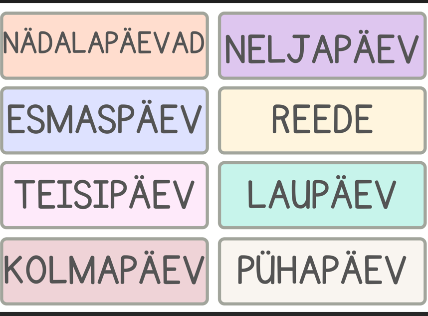 Failis on pastellsetes toonides nädalapäevade nimetused, mida saab välja lõigata ja lamineerida.