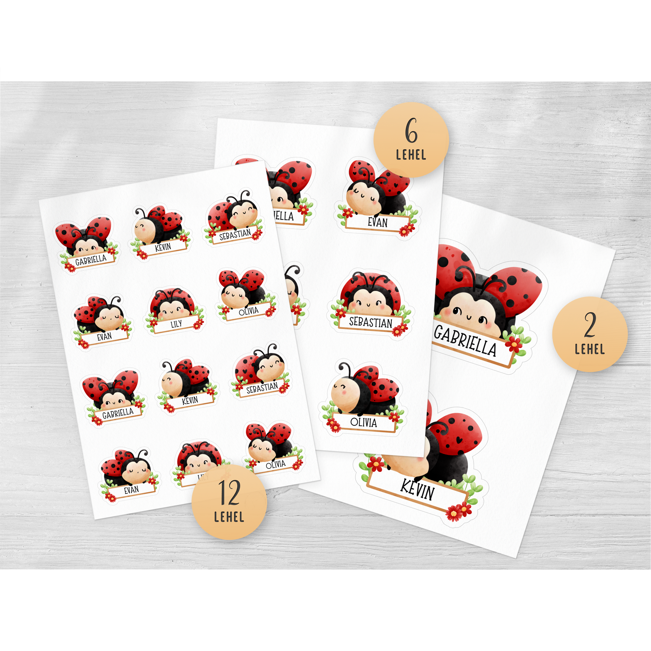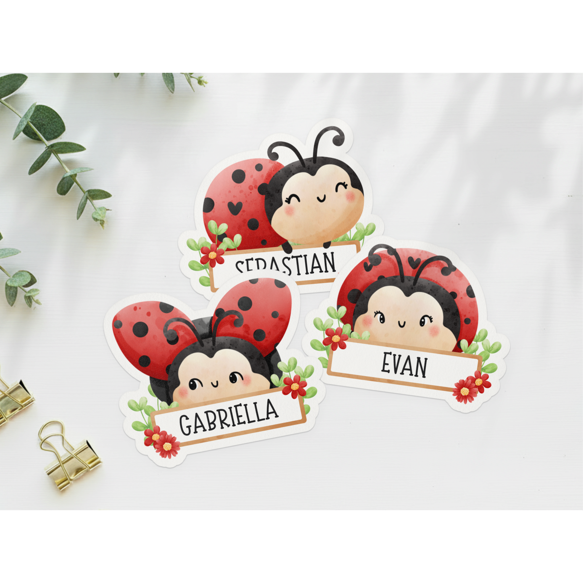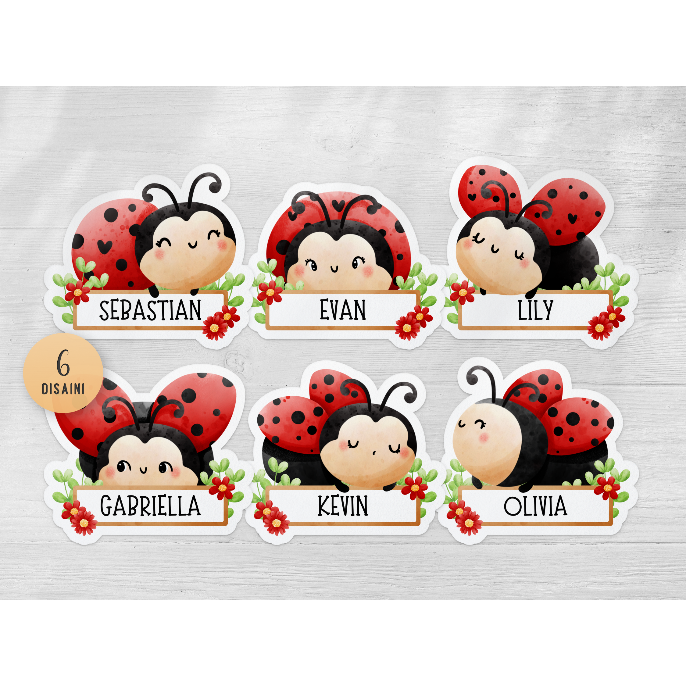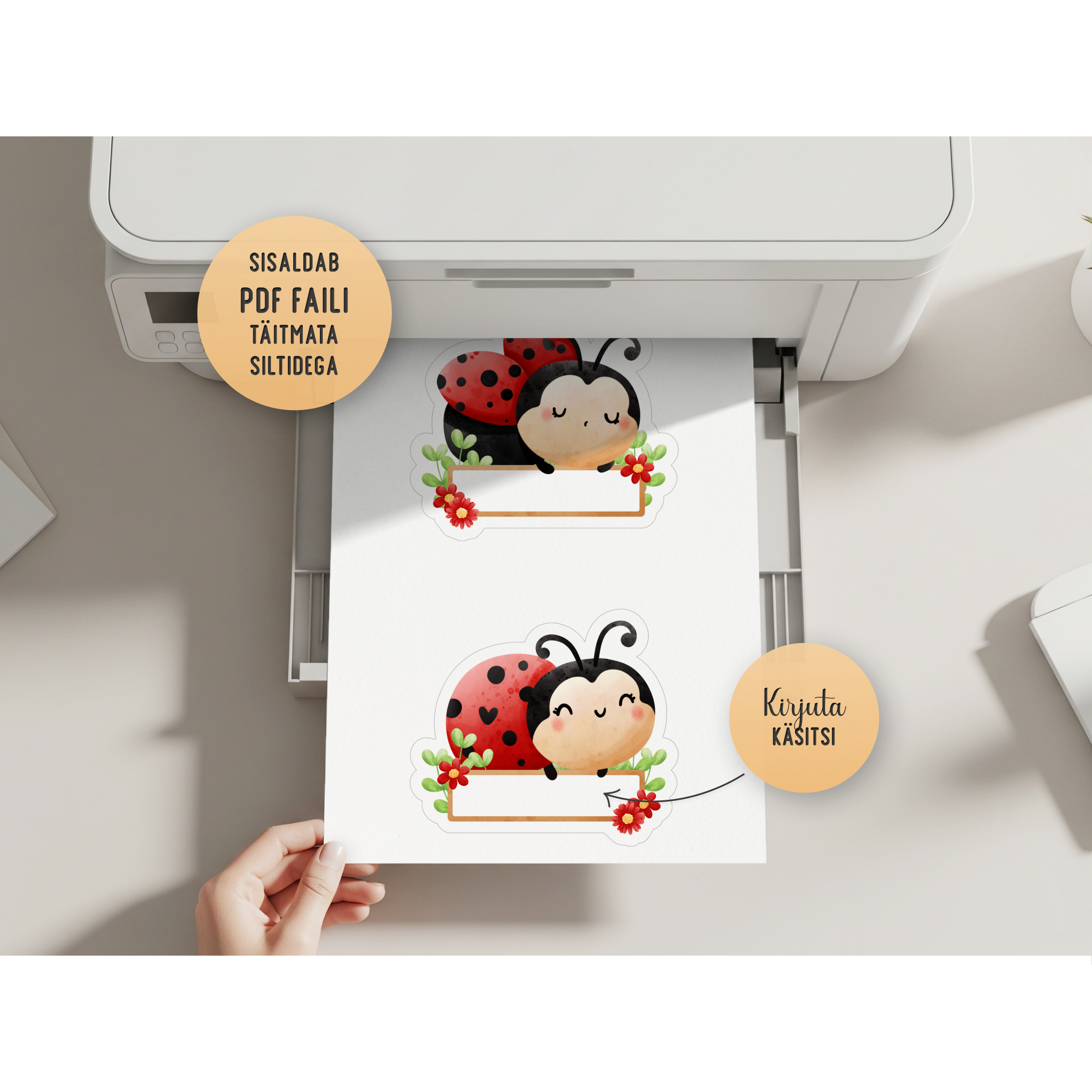 Lepatriinudega nimesildid, mis sobivad ideaalselt lasteaiakappidele. Võimalik on muuta teksti Canvas või printida täitmata sildid ja kirjutada nimed käsitsi.