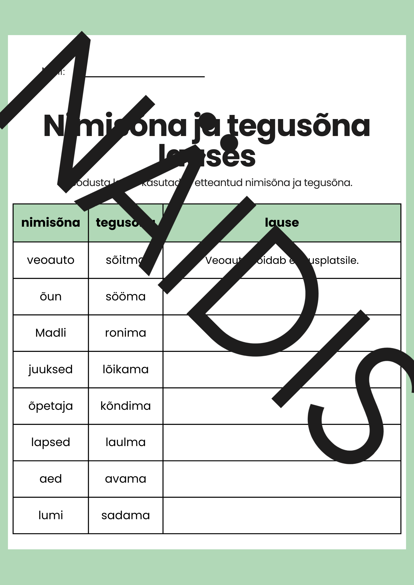 Koosta lause kasutades etteantud nimisõna ja tegusõna.