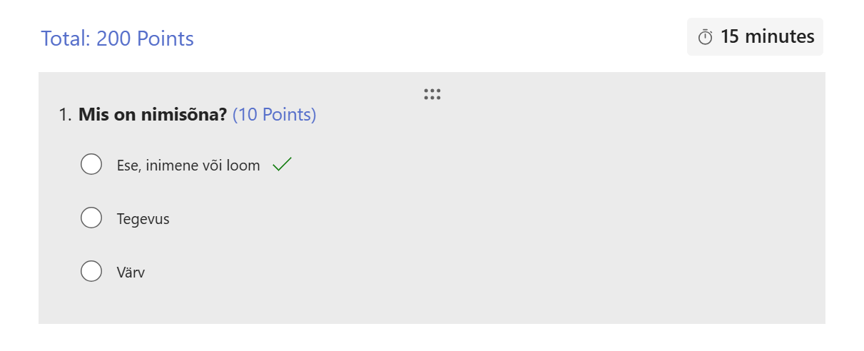 See digiülesanne aitab õppijal ära tunda nimisõnu – sõnu, mis nimetavad inimest, looma, kohta või eset. Ülesanne sisaldab 20 valikvastusega küsimust, mis on lühikesed, selged ja jõukohased nii algklasside õpilastele kui ka neile, kelle eesti keele oskus on alles kujunemas. Iga õige vastus annab 10 punkti, mis tähendab, et maksimaalne tulemus on 200 punkti. Lahendamiseks on ette nähtud 15 minutit, mis sobib hästi nii tunnitööks, iseseisvaks harjutamiseks kui ka kergeks kontrolltööks.