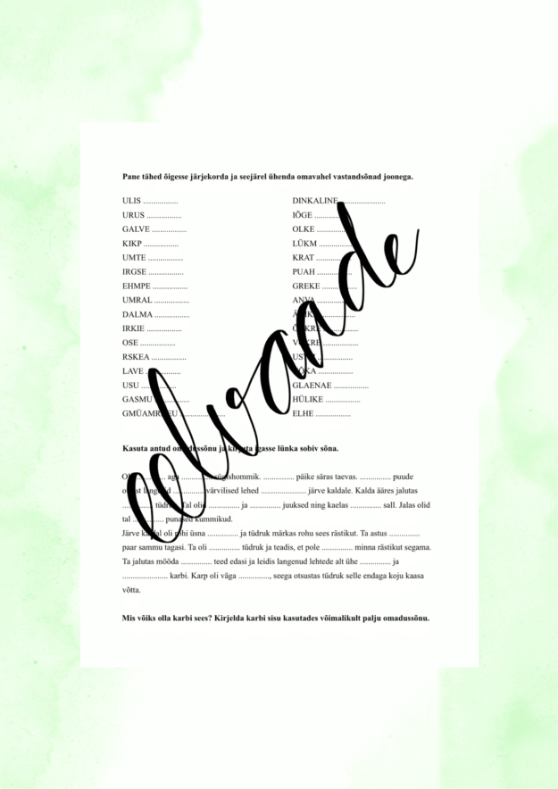 Omadussõnade tähed tuleb õigesse järjekorda panna, neile vastand leida ja seejärel sõnu lünktekstis kasutada.