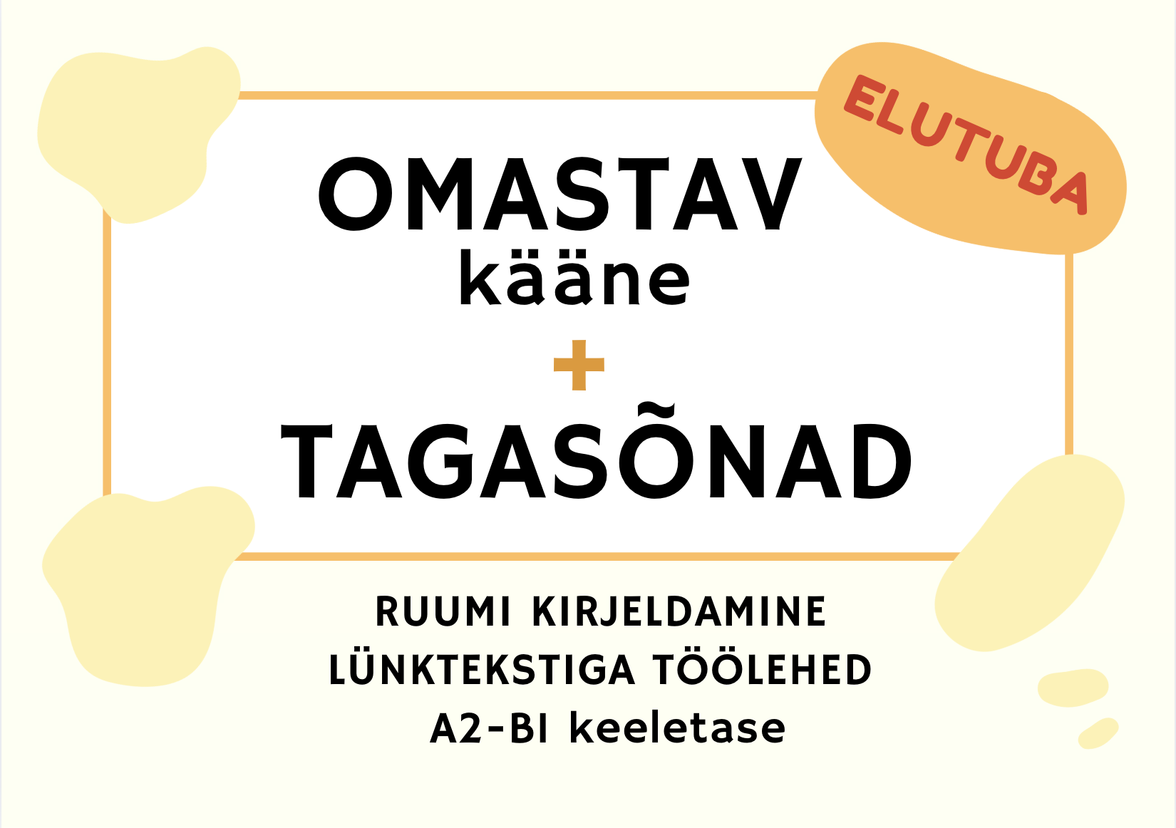Lünktekstiga töölehed teemal “ELUTUBA” – nimi- ja omadussõnade omastava käände (2. vormi) ja tagasõnade harjutamiseks.