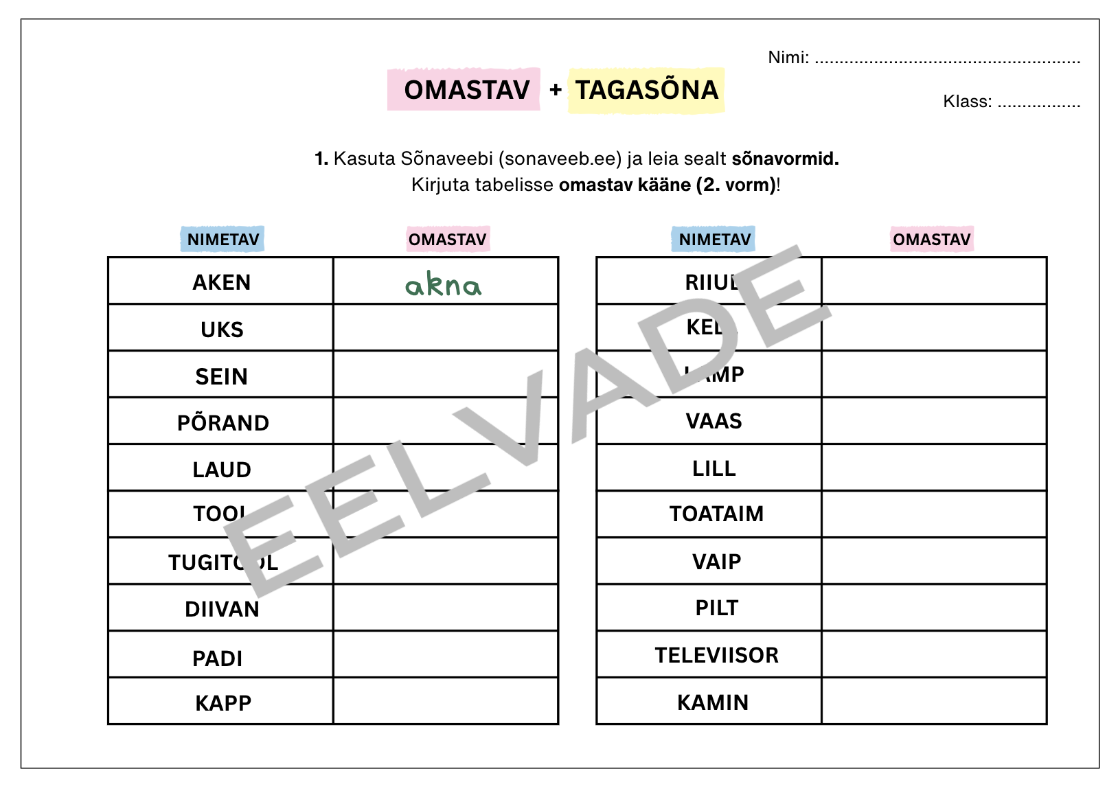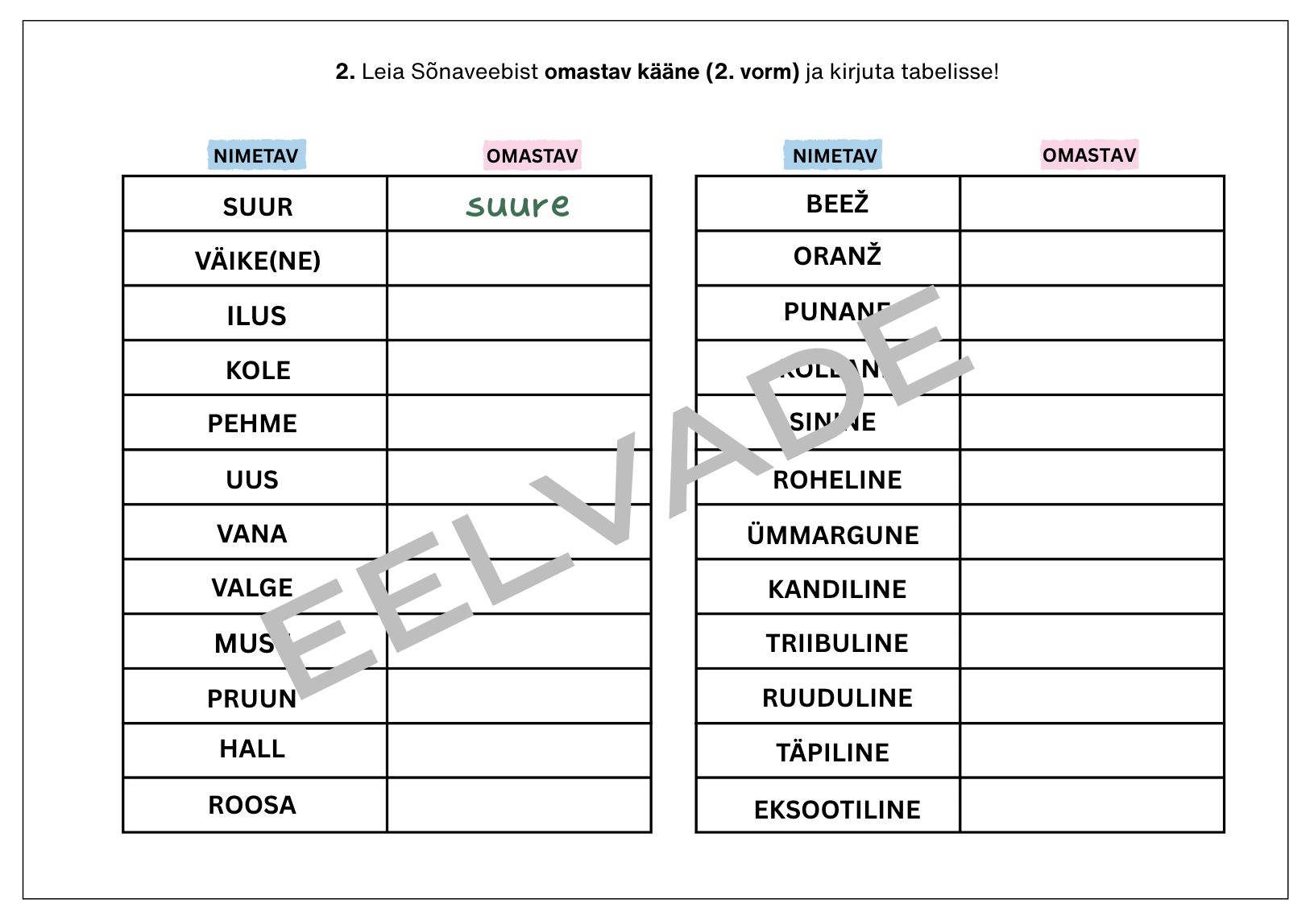 Esmalt täidetakse Sõnaveebi või õpetaja abil kaks tabelit, kuhu pannakse kirja nimisõnade (tool, sein, vaip jm) ja omadussõnade (suur, sinine, pehme jm) omastav kääne.