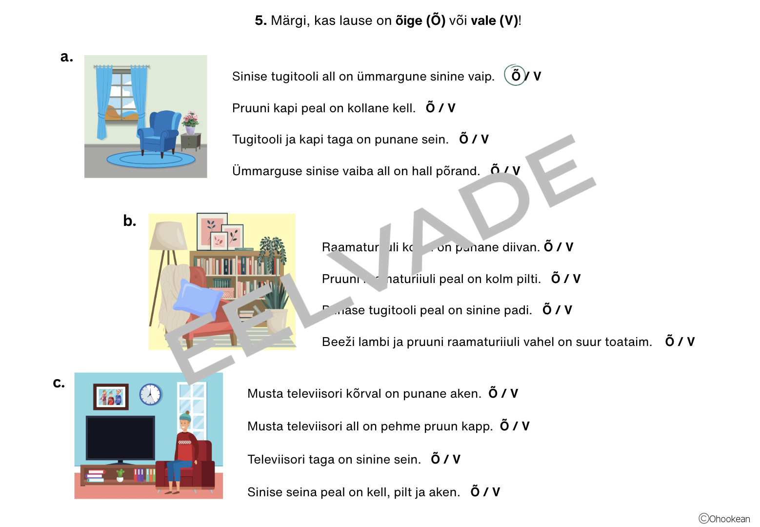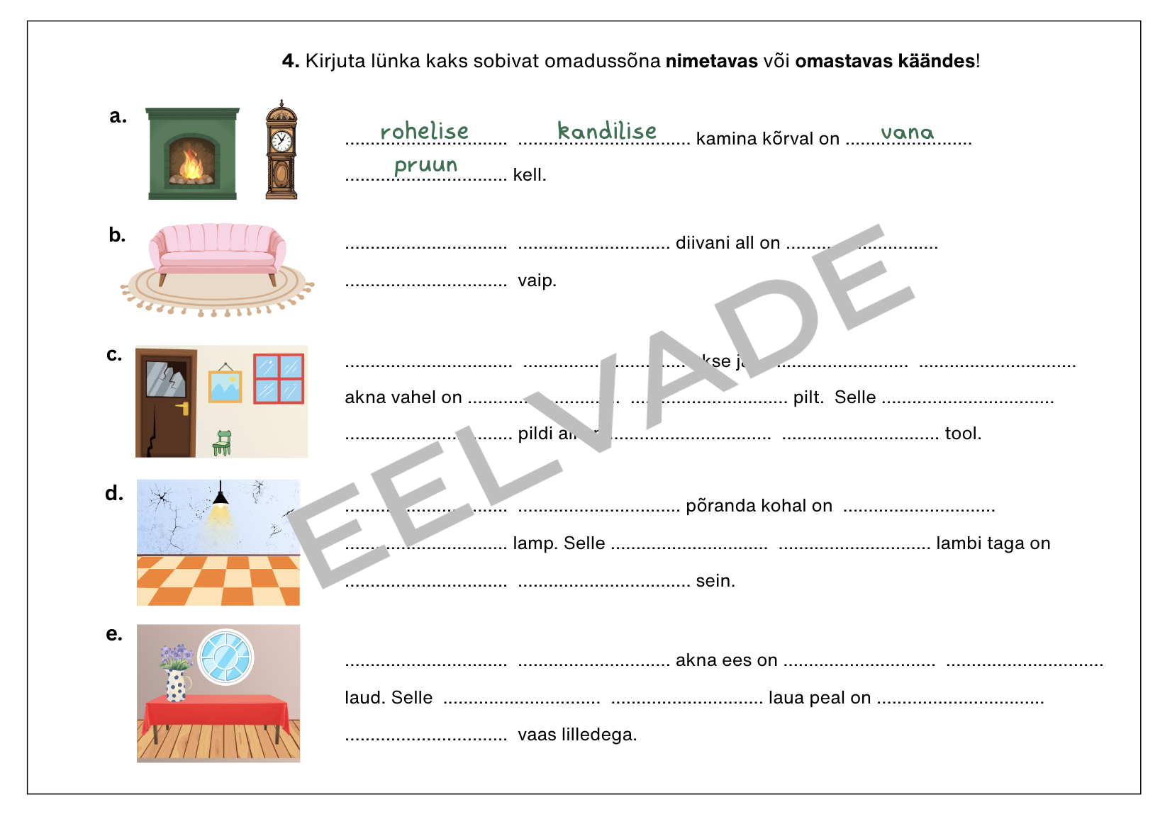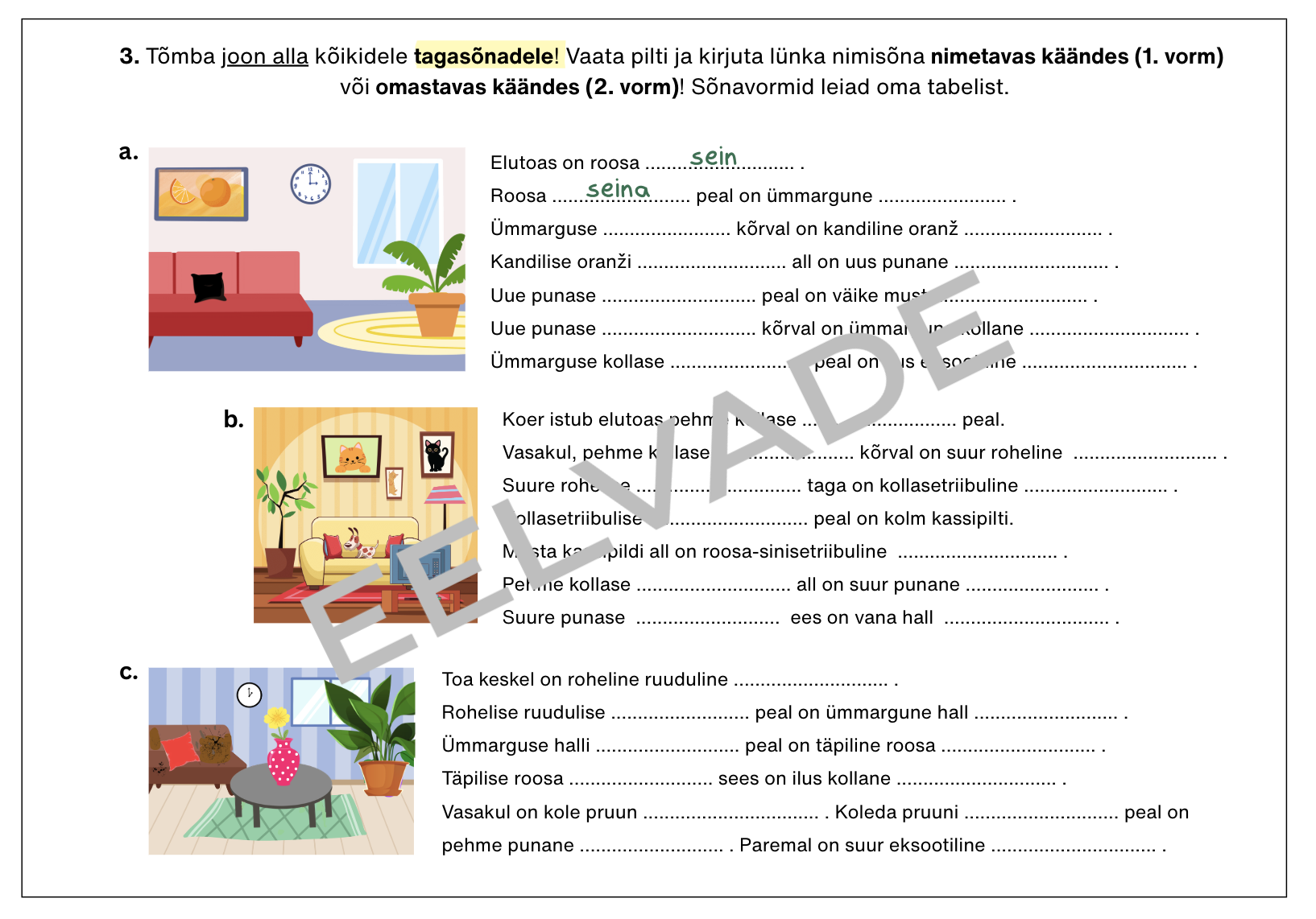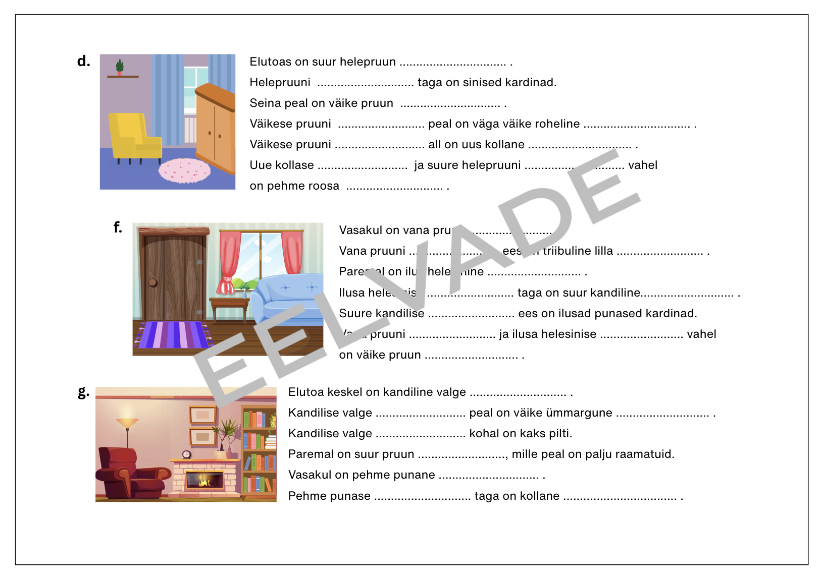 Töölehtede komplekti (6 lk) abil kirjeldab õpilane elutuba ja elutoas olevaid esemeid, nende värvi, kuju ning tunnuseid, harjutades omastava käände (2. vormi) kasutamist koos tagasõnadega.