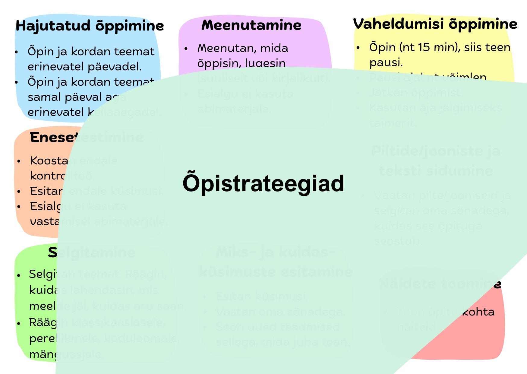 8 õpistrateegiat, mis toetavad õppija oskust õppida tõhusamalt ja teadlikumalt. Materjal tutvustab erinevaid praktilisi võtteid, mis aitavad paremini õpitavast aru saada ja meelde jätta.