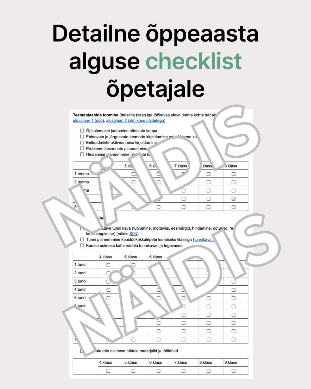 Läbimõeldud nimekiri tegevustest, mis aitavad õpetajal süsteemselt planeerida uut õppeaastat ning selleks ettevalmistusi teha. Nimekiri lihtsustab ettevalmistusprotsessi ja katab kõik olulised valdkonnad õpetajatöös.
