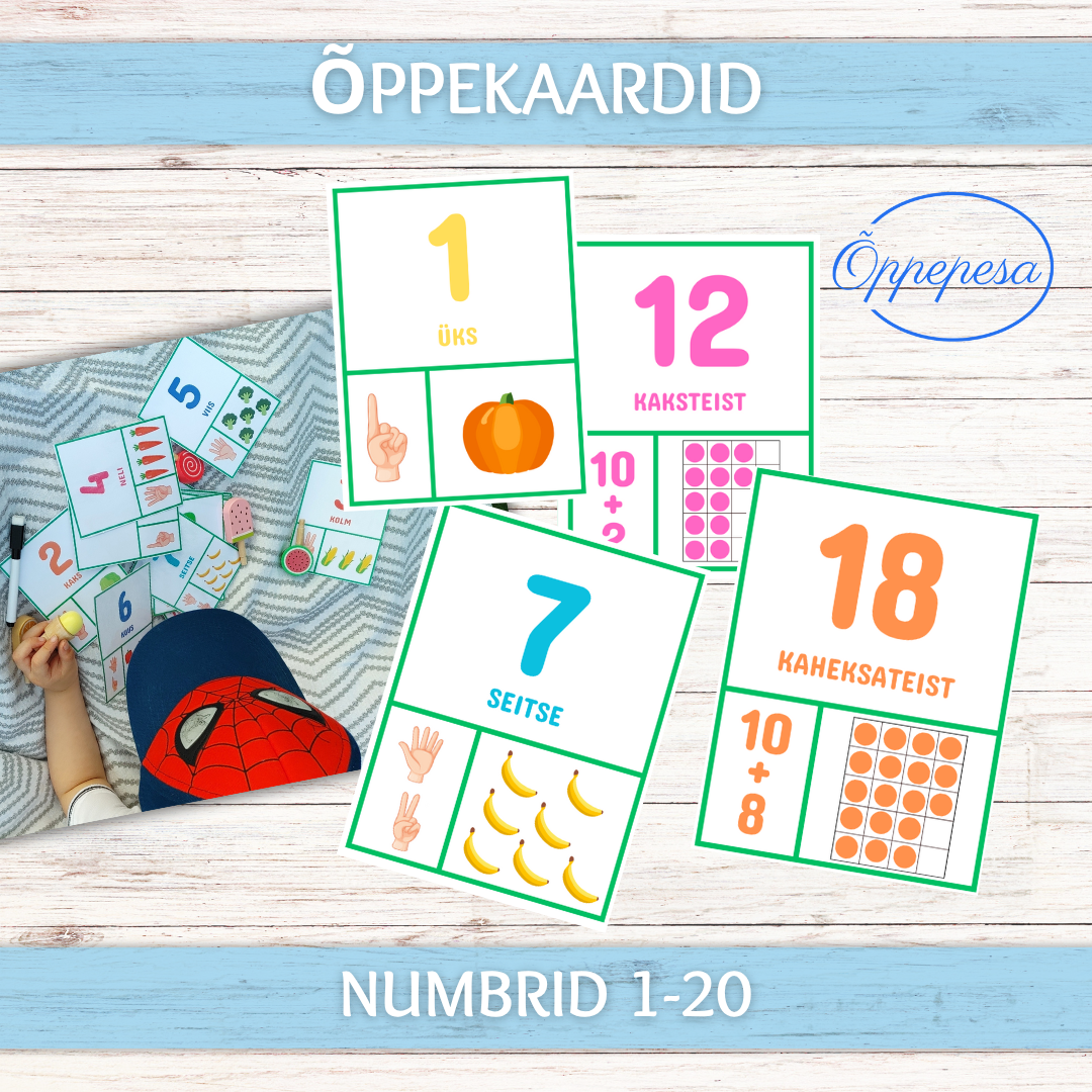 Neid 1-20 värvilisi numbrite õppekaarte saab kasutada mitmesuguste tegevuste jaoks. Segage need ja laske lastel kaardid ette- või tahapoole järjestada. Või asetage kaardid mööda tuba ja otsige need ükshaaval üles.