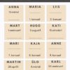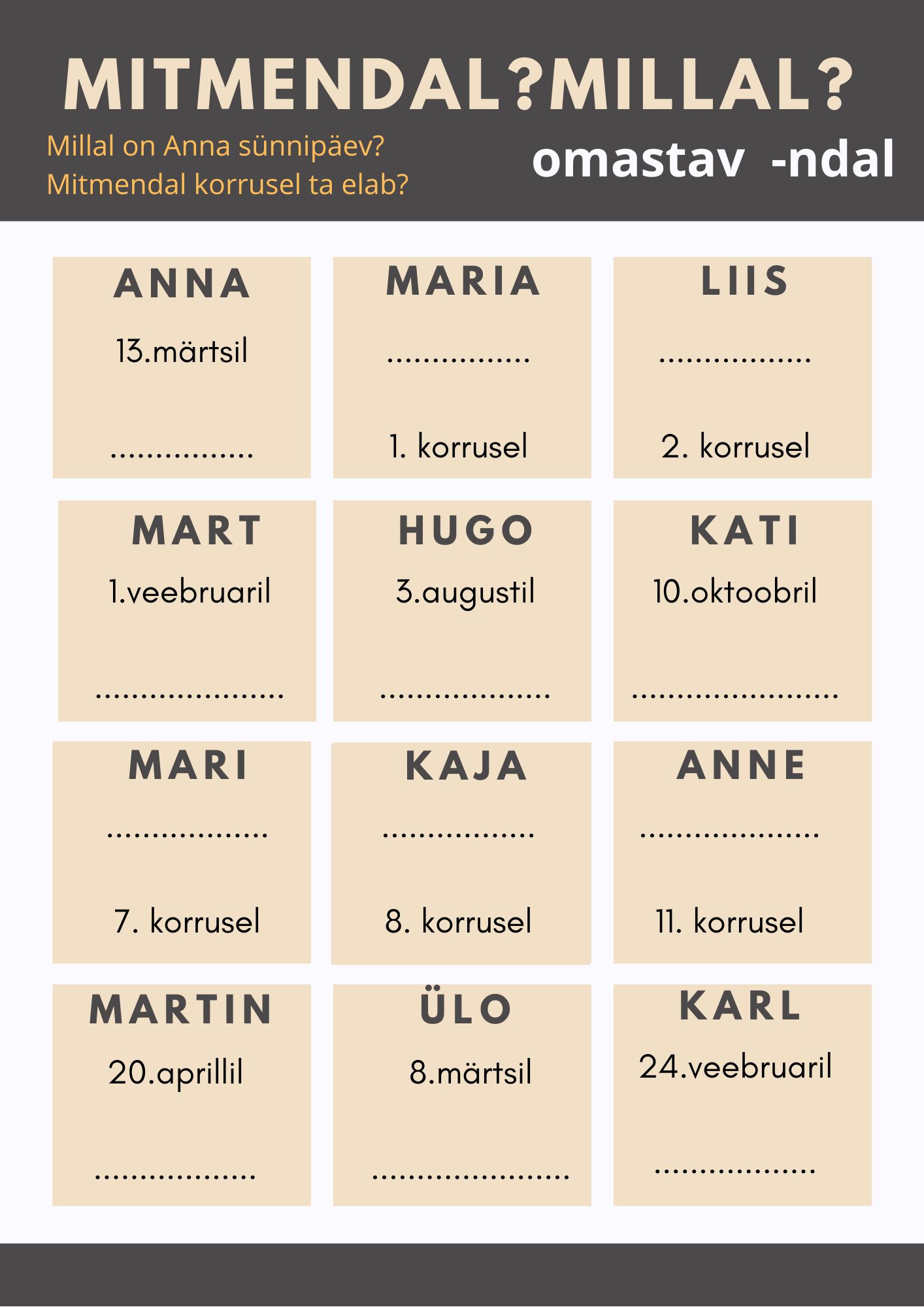 See on paaristöö, kus ühel õppijal on üks leht ja teisel on teine, paarilisel A on olemas nt kuupäev, millal on Anna sünnipäev, aga paarilisel B seda pole, seega B ksib A-lt, Millal on Anna sünnipäev. Kui paarilisel ei ole kirjas korrust, siis samamoodi ta küsib, Mitmendal korrusel Anna elab jne.