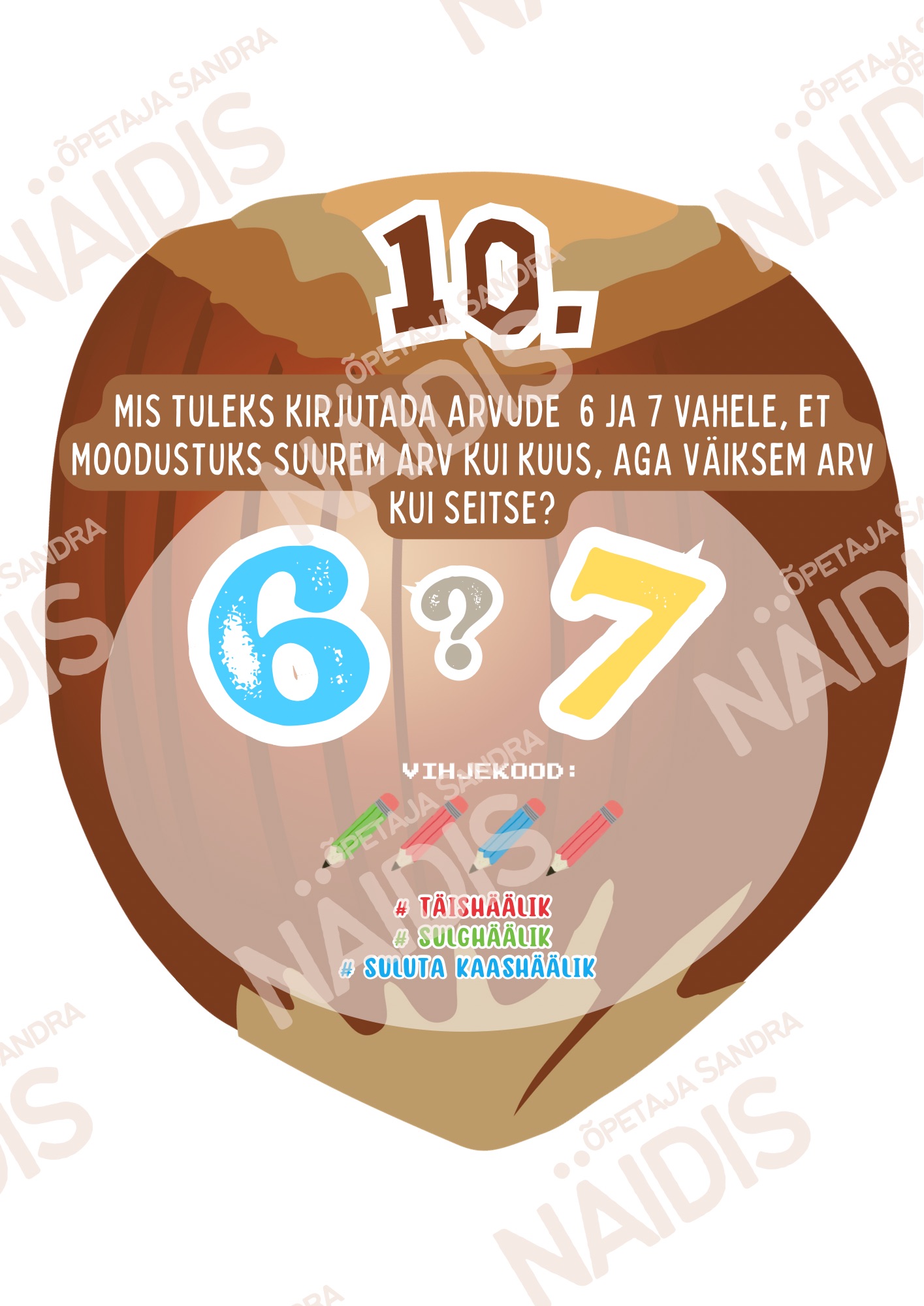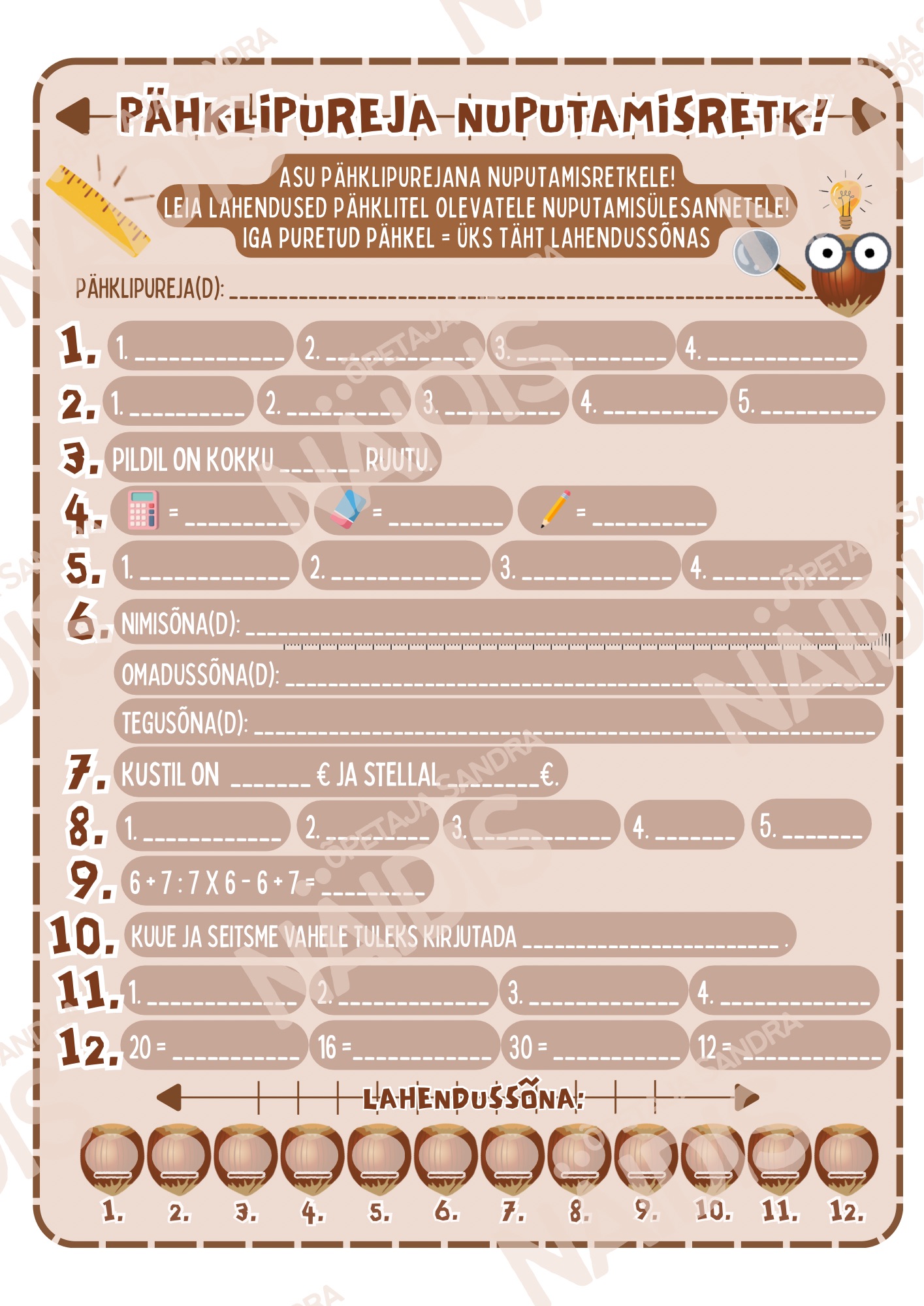 🤓 Nuputamisülesanded on jõukohased algklasside õpilastele, ent tõenäoliselt panevad mõtlema ka pisut vanemaealise õppuri. Retke saab korraldada nii sise- kui välikeskkonnas ning “pähklipurejad” võivad tegutseda nii individuaalselt kui rühmas. Tore viis õpilased liikuma, tegutsema ja nuputama ärgitada!