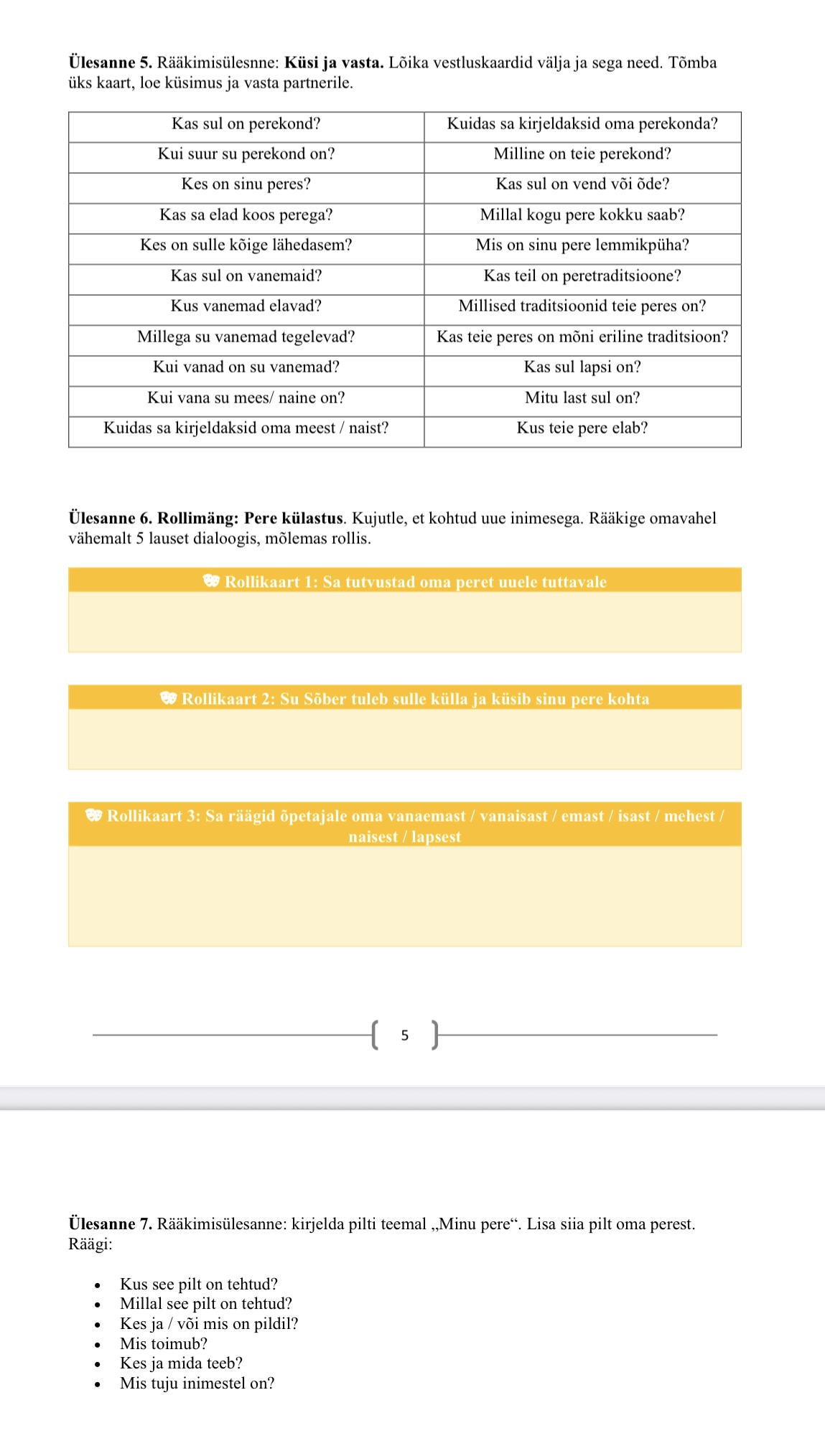 Õppematerjal sisaldab 9 lehte ja 10 rääkimis- ja kirjutamisülesannet.