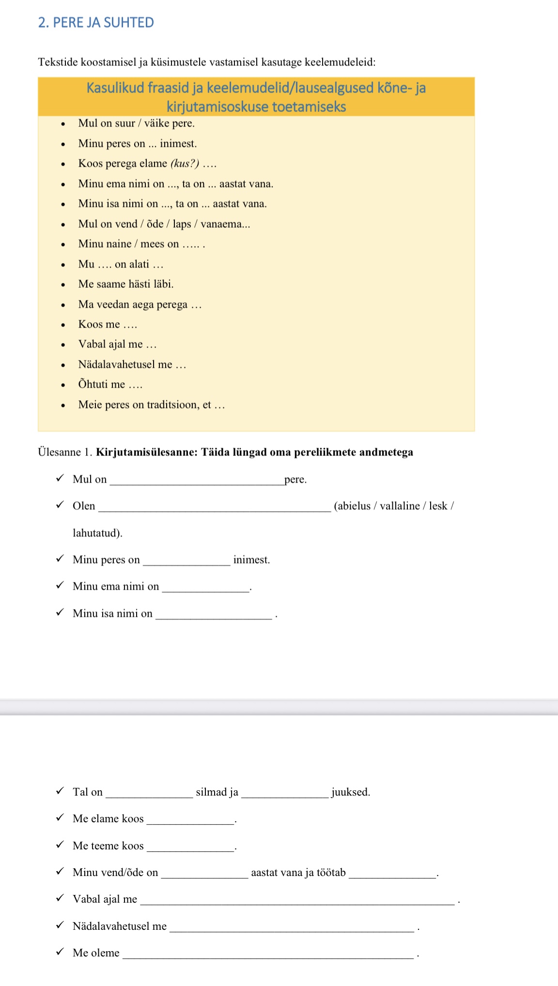 PERE JA SUHTED. Rääkimis- ja kirjutamisülesanded A2-taseme eesti keele õppijale
