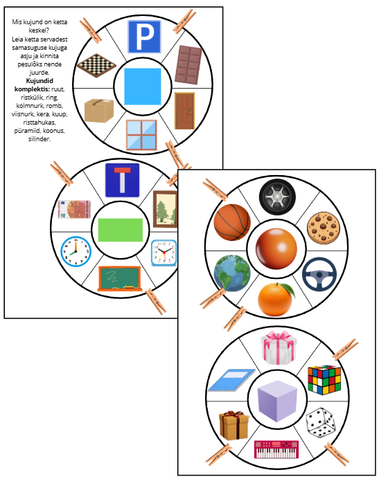 Pesulõksumäng kujundite õppimiseks. Iga mänguketta keskel on üks kujund. Servadel on erinevad objektid. Lapse ülesandeks on panna pesulõksud nende asjade juurde, mis on kettal näidatud kujuga. Ühtlasi arendab mäng ka peenmotoorikat ja sõnavara.