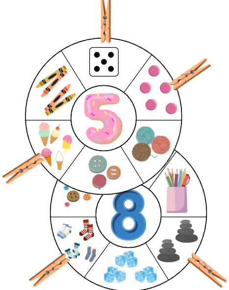 Iga mänguketta keskel on üks number ühest kümneni. Servadel on erinevad objektid. Lapse ülesandeks on objektid kokku loendada ja panna pesulõksud nende asjade juurde, mida on kettal näidatud arv.