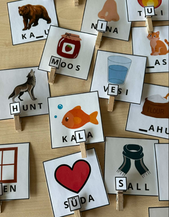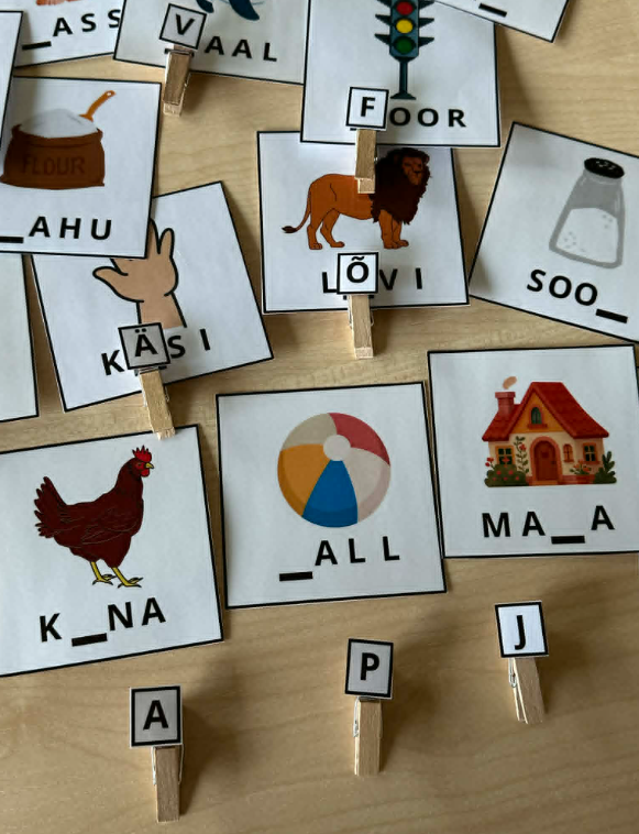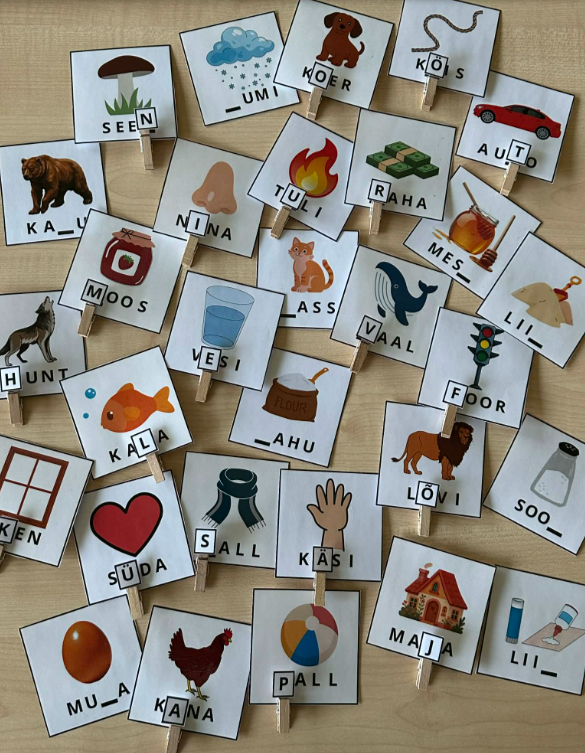 Lugemismäng, sõnades on 1 täht puudu. Laps saab asetada puuduolevale kohale pesulõksule kinnitatud tähe. Või siis saab puuduoleva tähe lehele kirjutada või liimida. Failis on kokku 30 pilti/sõna ning lisaks 21 väljalõigatavat tähte. Tähti saab printida mitu eksemplari, siis jagub igale kaardile.