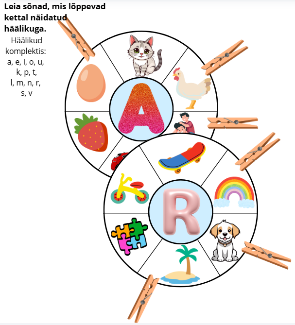 Pesulõksumängud häälik- ja foneemanalüüsi oskuse arendamiseks. Iga mänguketta keskel on üks täht. Servadel on erinevad objektid. Lapse ülesandeks on panna pesulõksud nende asjade juurde, mis algavad/lõppevad kettal näidatud häälikuga või milles kostab kettal näidatud häälik teistest pikemalt.