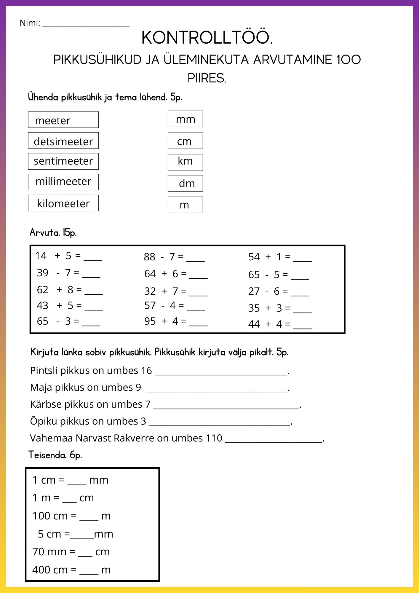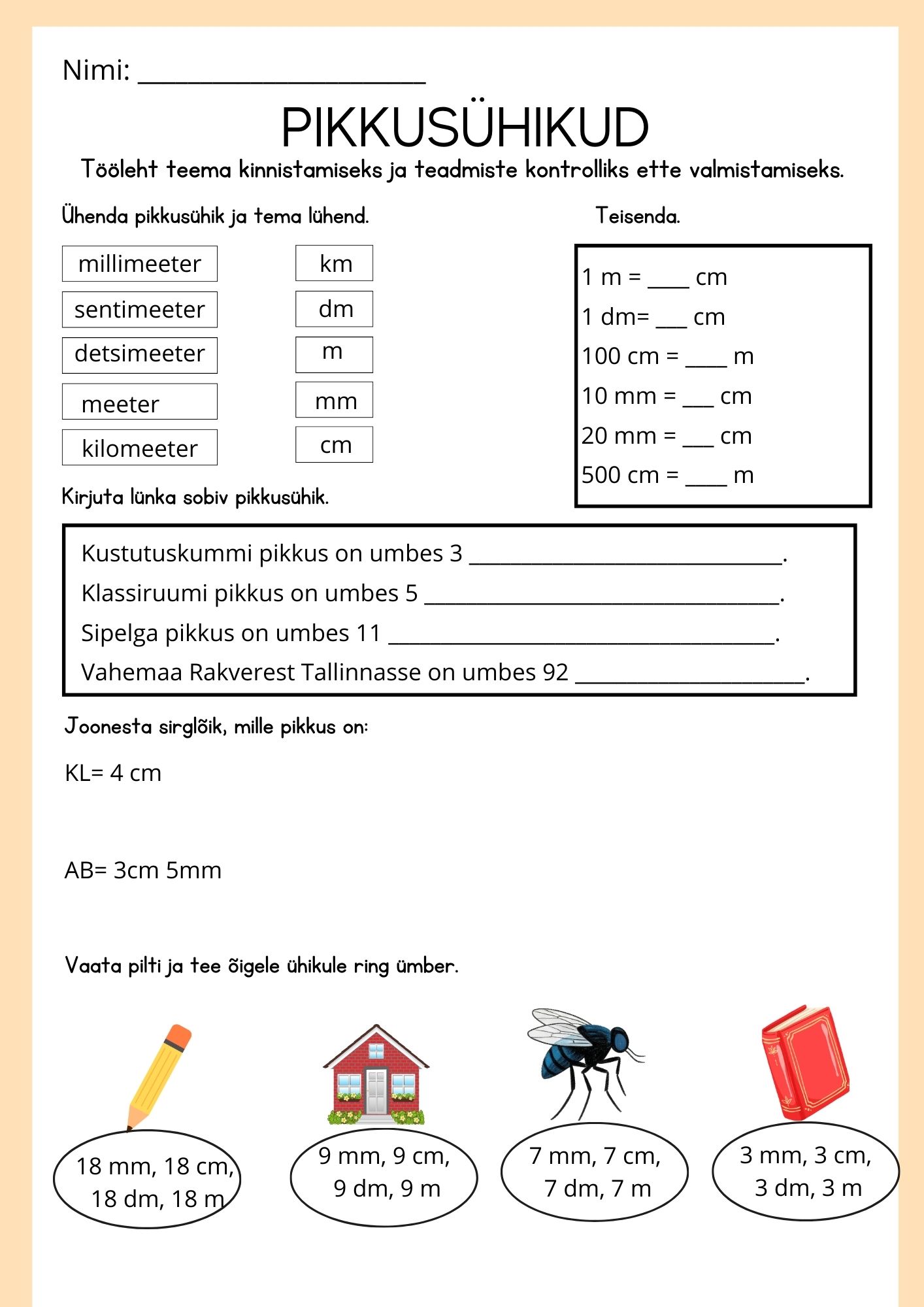 Pikkusühikute kinnistamiseks tööleht ning teadmiste kontroll.