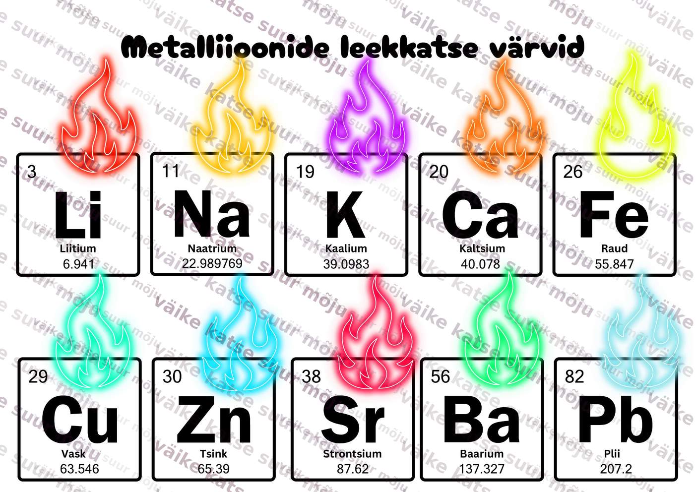 Värviline seinaplakat, mis sisaldab 10 metalli leekkatse värve koos elemendi sümboli, nime, aatomnumbri ja aatommassiga.