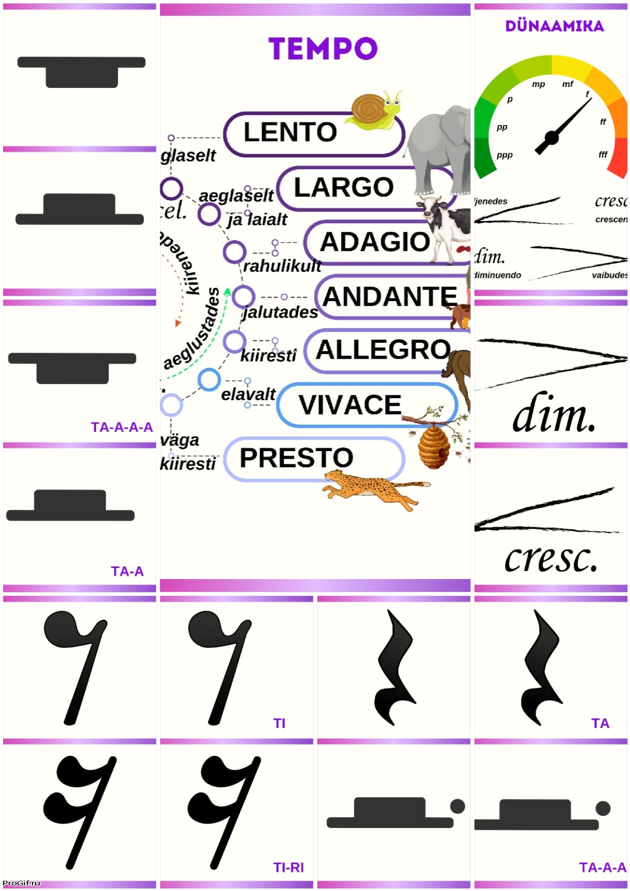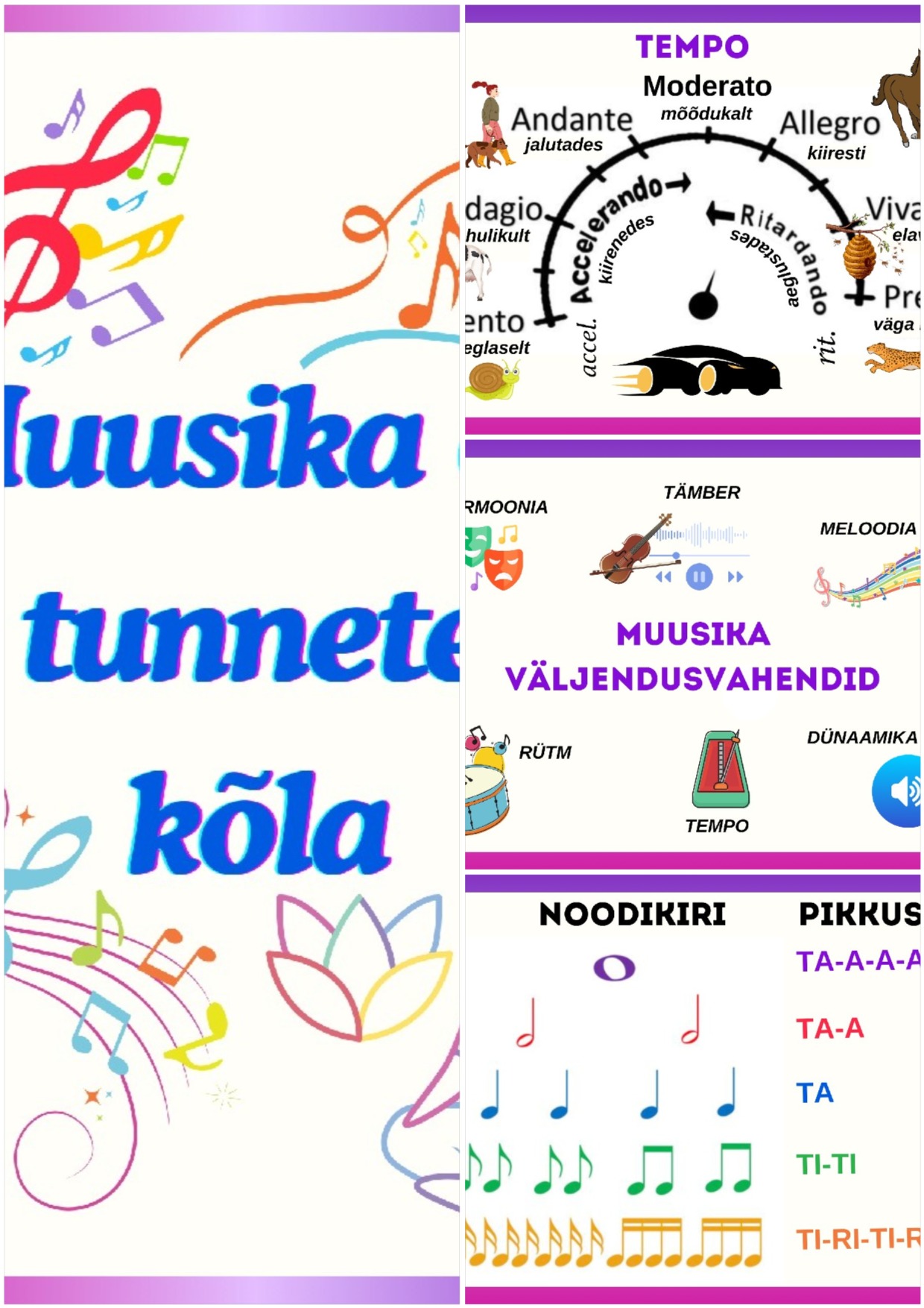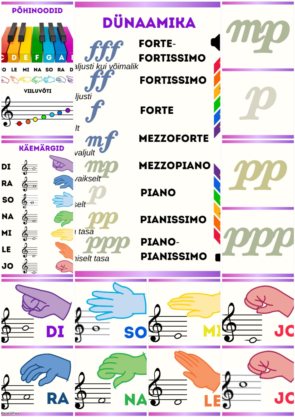 Komplekt sisaldab kauneid ja selgeid plakateid, mis aitavad sul süsteemselt õppida muusikalisi põhimõisteid: muusika väljendusvahendid, tempo, dünaamika, helivältused, põhinoodid, pausid, akordid ja käemärgid.