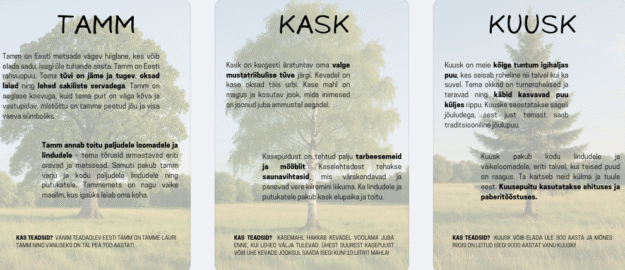 Tamm, Kask, Kuusk, Mänd, Pihlakas, Pärn, Haab, Lepp, Paju, Jalakas.