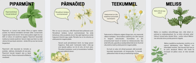 Piparmünt, pärnaõied, teekummel, meliss, raudrohi, nõges, saialill, põdrakanep, islandi samblik, mustsõstar.