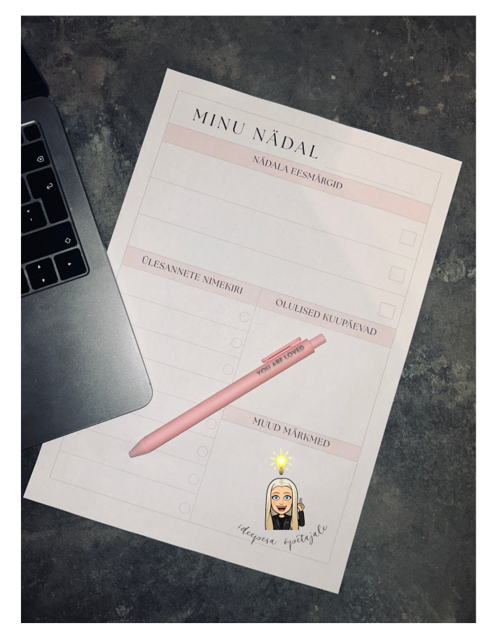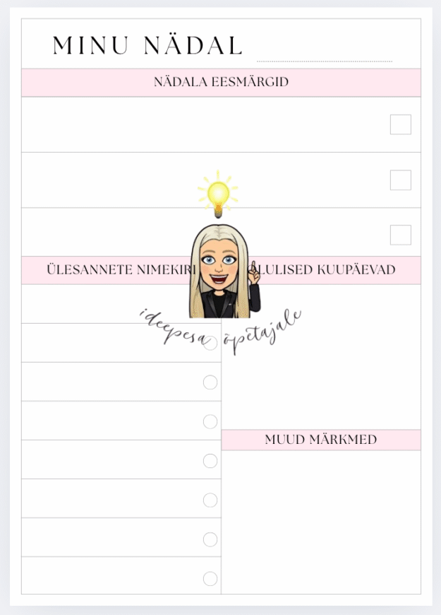 Planeerimisleht, mis aitab õpetajal hoida fookust nädala eesmärkidel, olulistel kuupäevadel ja ülesannetel, mis vajavad tegemist.