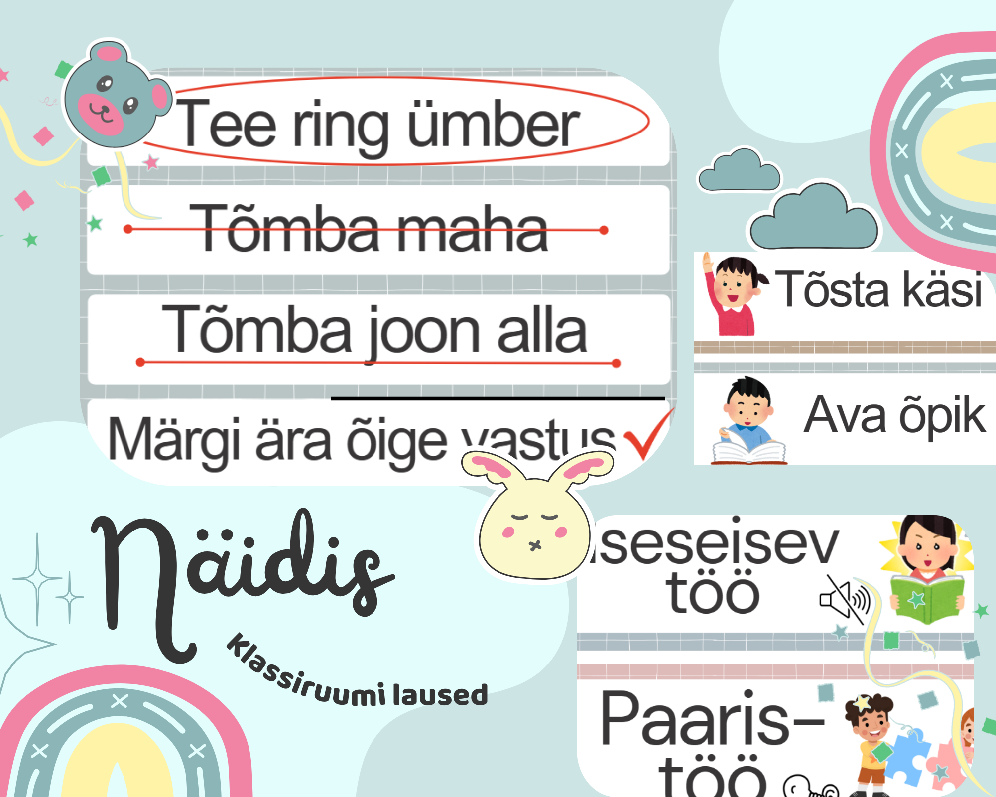Klassiruumi laused ja fraasid ehk “Rääkivad seinad” Failis klassis põhiliselt kasutatavad sõnad – “Paaristöö”, “Kuula”, “Tõsta käsi” ning töölehe täitmiseks piltlik juhis – “Tõmba maha”, “Tee ring ümber”. Prindi välja ja paigalda oma klassis nähtavale kohale. Tööjuhist andes viita pildile või lase õpilastel valida.