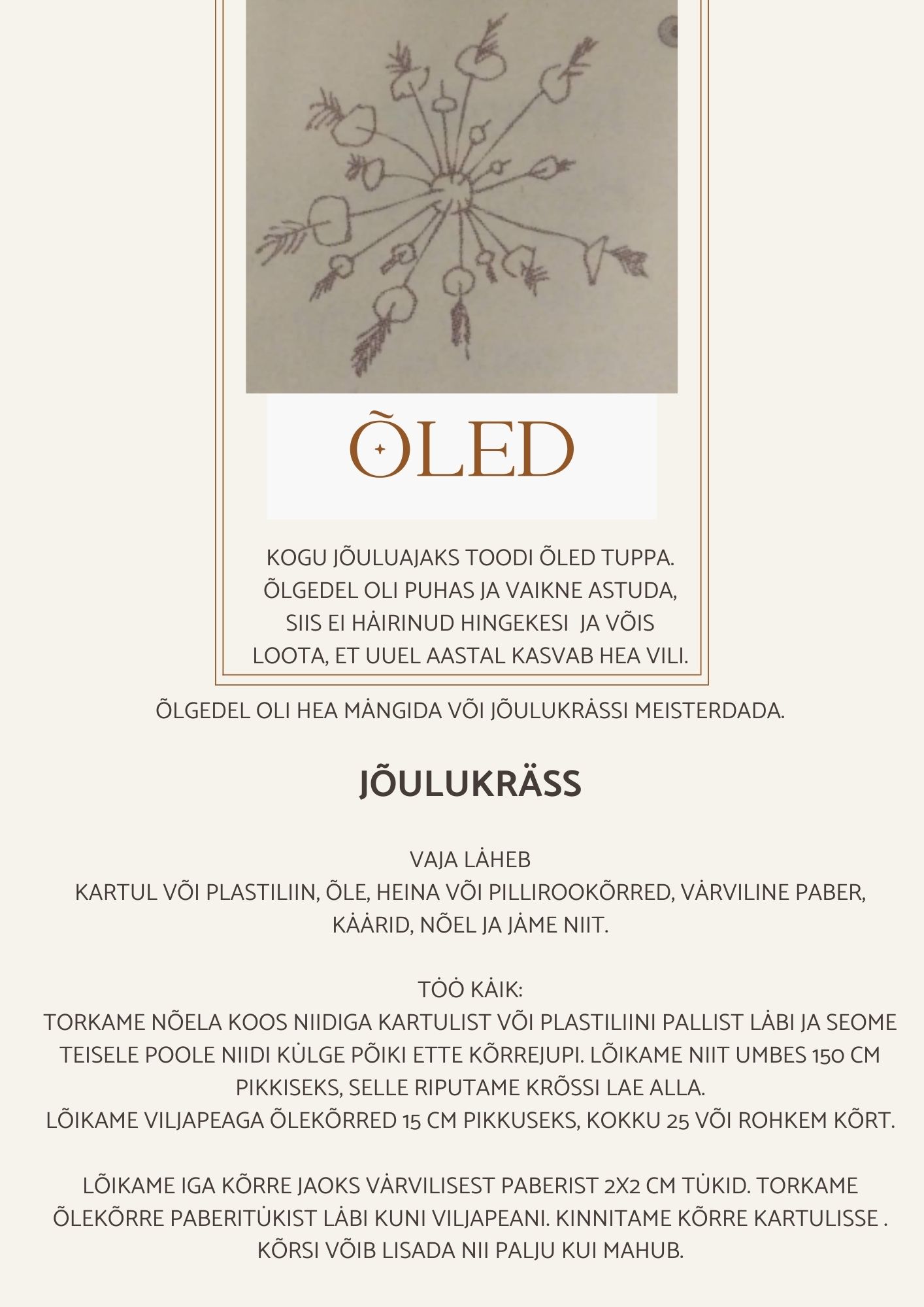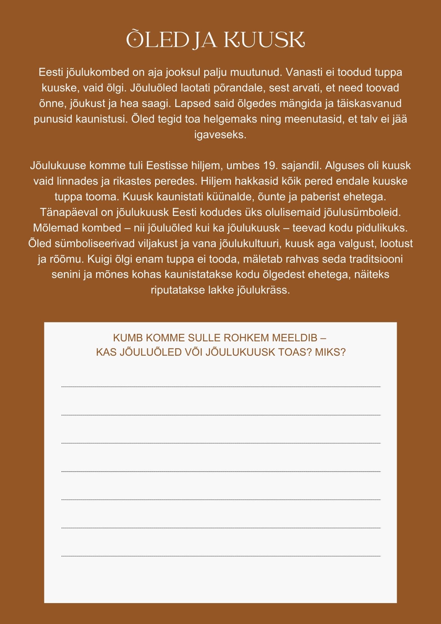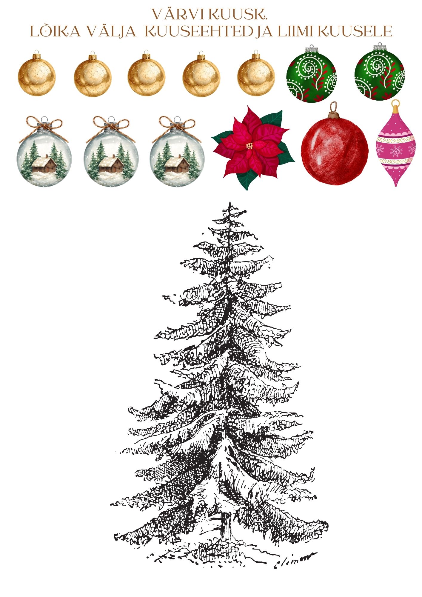 Sisaldab: lugemisülesannet, jõulukrässi meisterdamise juhist, värvimise lehti ja kuuse otsimise mängu.