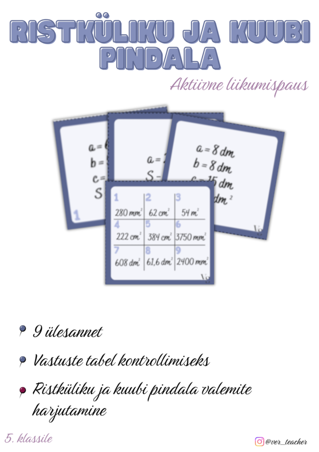 Materjal on mõeldud ristküliku ja kuubi pindala leidmise harjutamiseks. Õpilased liiguvad klassiruumis, lahendavad ülesandeid ja kinnistavad pindala valemite kasutamist aktiivses vormis.