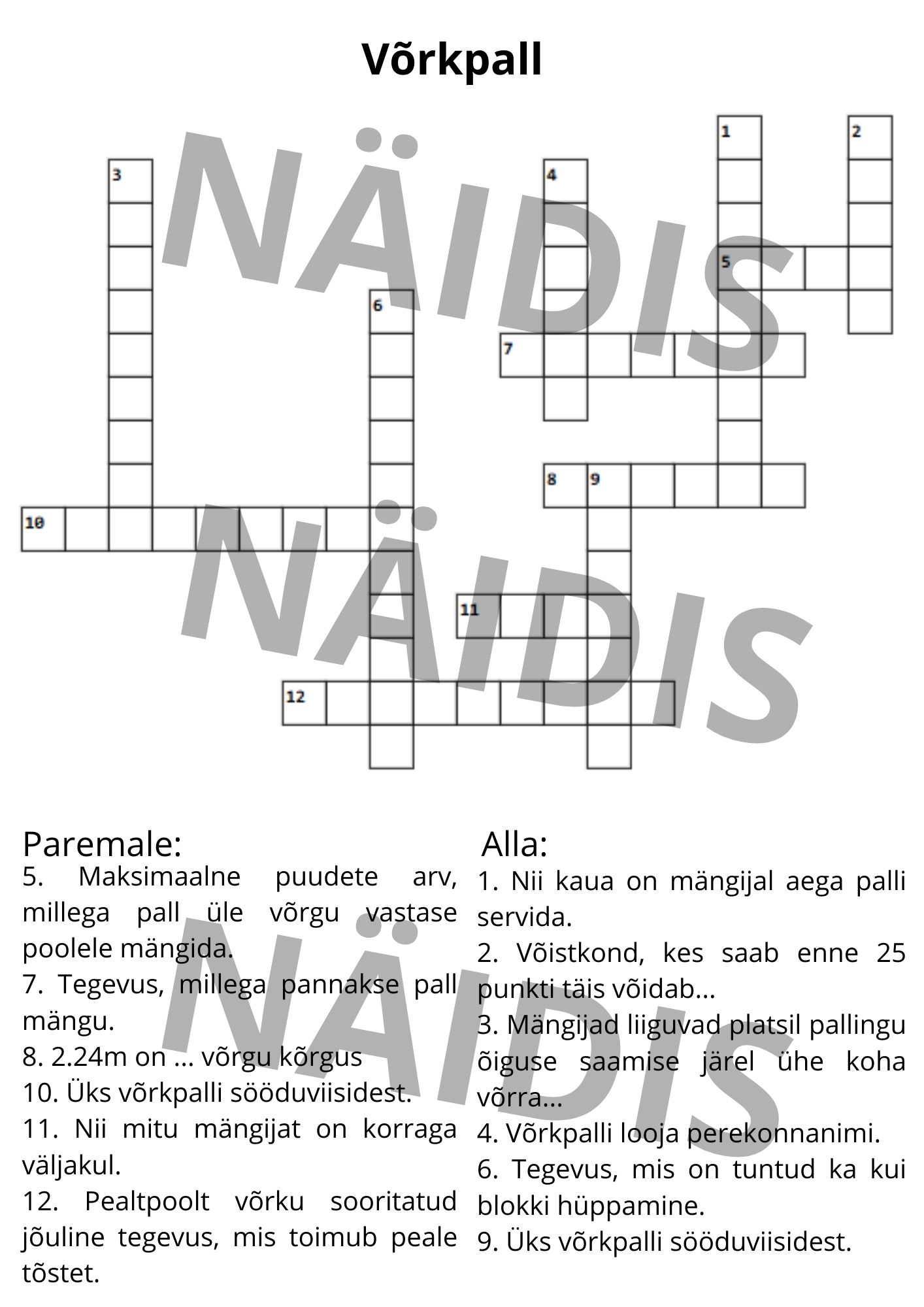 Ristsõna võrkpalli kohta tunni tegevustest vabastatud õpilasele, lisaülesandena vmt.