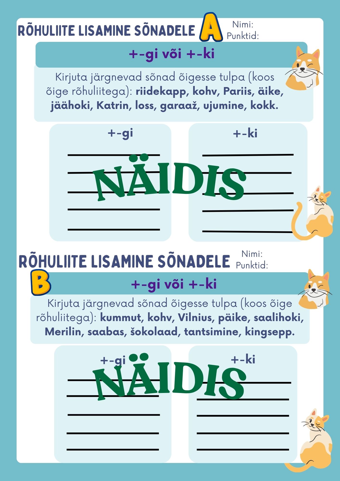 Rõhuliite (-gi, -ki) lisamine sõnadele. Tunnikontroll (A ja B variant) koos vastustega.