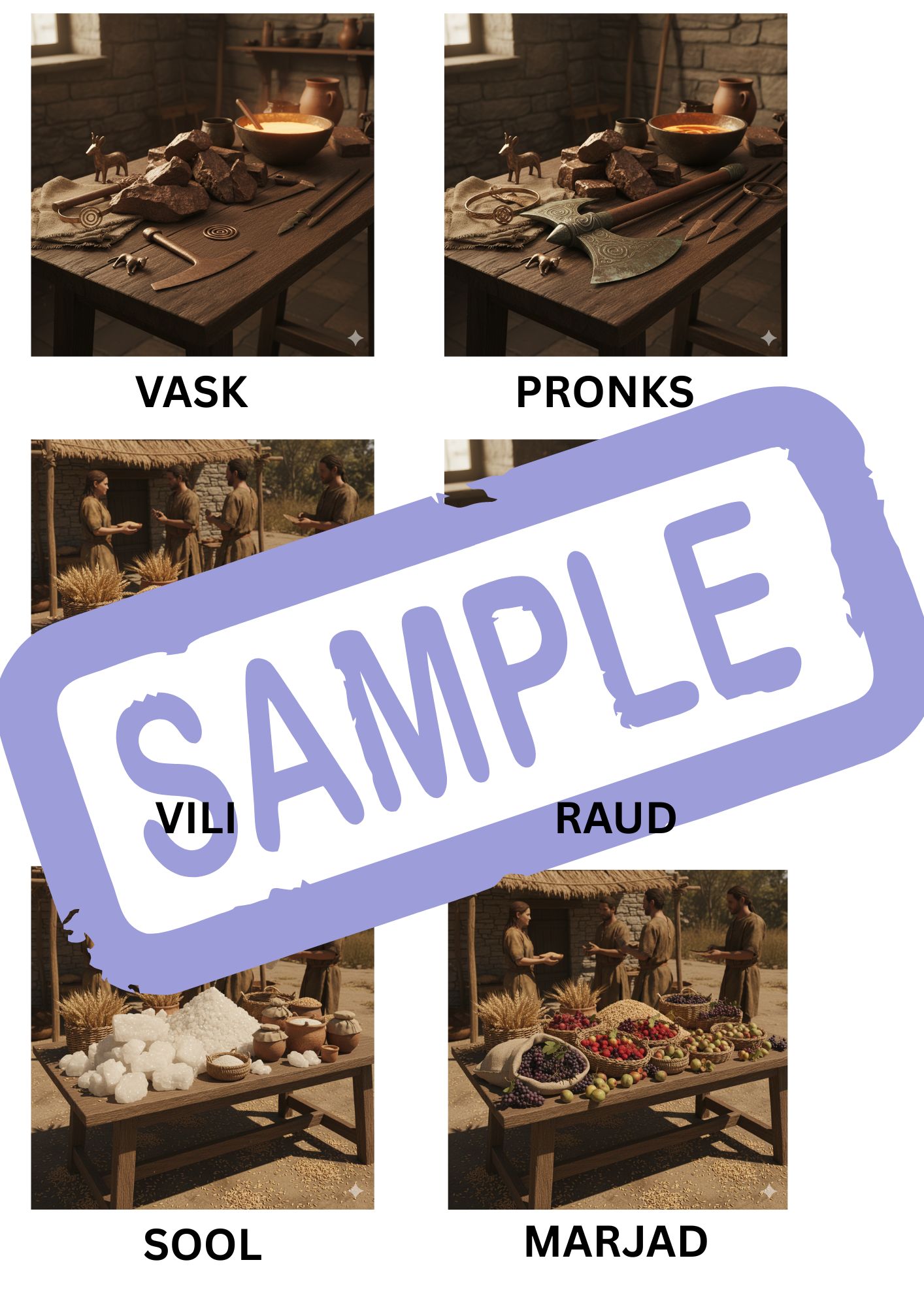 - Õpilased saavad kaardid: vask, pronks, raud, sool, vilI, marjad. Igal lapsel on üks kaart. Prindi mängukaarte piisav kogus.