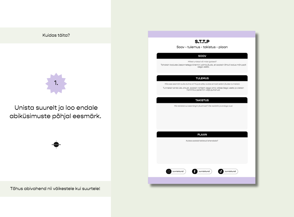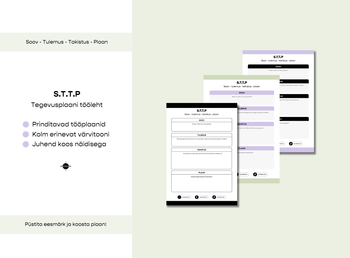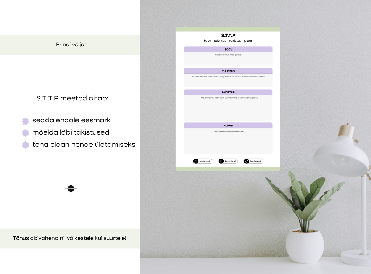 Eesmärgid olemas, aga pole selget plaani, kuidas nendeni jõuda? S.T.T.P tööleht aitab sul luua plaani, kuidas võimalikest takistustest hoolimata jõuda oma eesmärgini.