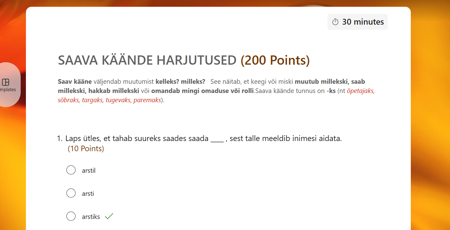 Õppija peab iga lause juures valima sõna, mis on saavas käändes. Ülesanne sisaldab 20 valikvastusega küsimust, mis on selged ja jõukohased nii 2.–5. klassi õpilastele kui ka täiskasvanutele, kes õpivad eesti keelt A1–A2 tasemel. Iga õige vastus annab 10 punkti, maksimaalne tulemus on 200 punkti, ning lahendamiseks on ette nähtud 30 minutit.