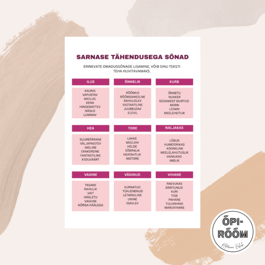 Sarnase tähendusega sõnad klassi seinale või õpilasele lisamaterjaliks, et kirjatööd oleksid mitmekesise sõnavaraga.